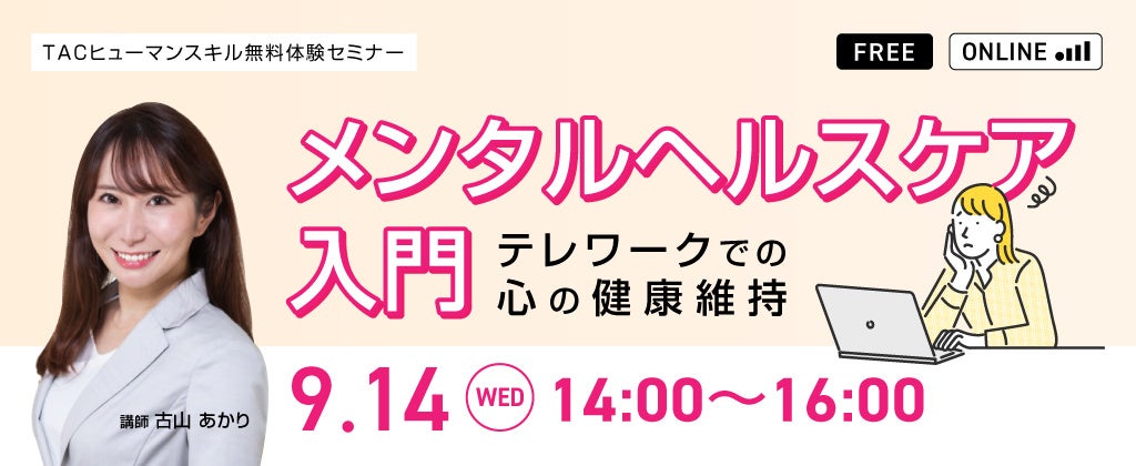 公認会計士や税理士など、多くの国家資格や検定試験の受験指導などの教育事業を展開しているTAC株式会社(東京都千代田区、代表取締役:多田敏男)は、法人向け人材教育部門から、コロナ禍において増加する「テレワークうつ」など、社員のメンタルヘルスの不調について、企業への影響や取り組むべき課題、取り入れることができるメンタルヘルスケアなどについて臨床心理士が解説する無料セミナーを2022年9月14日に実施します。