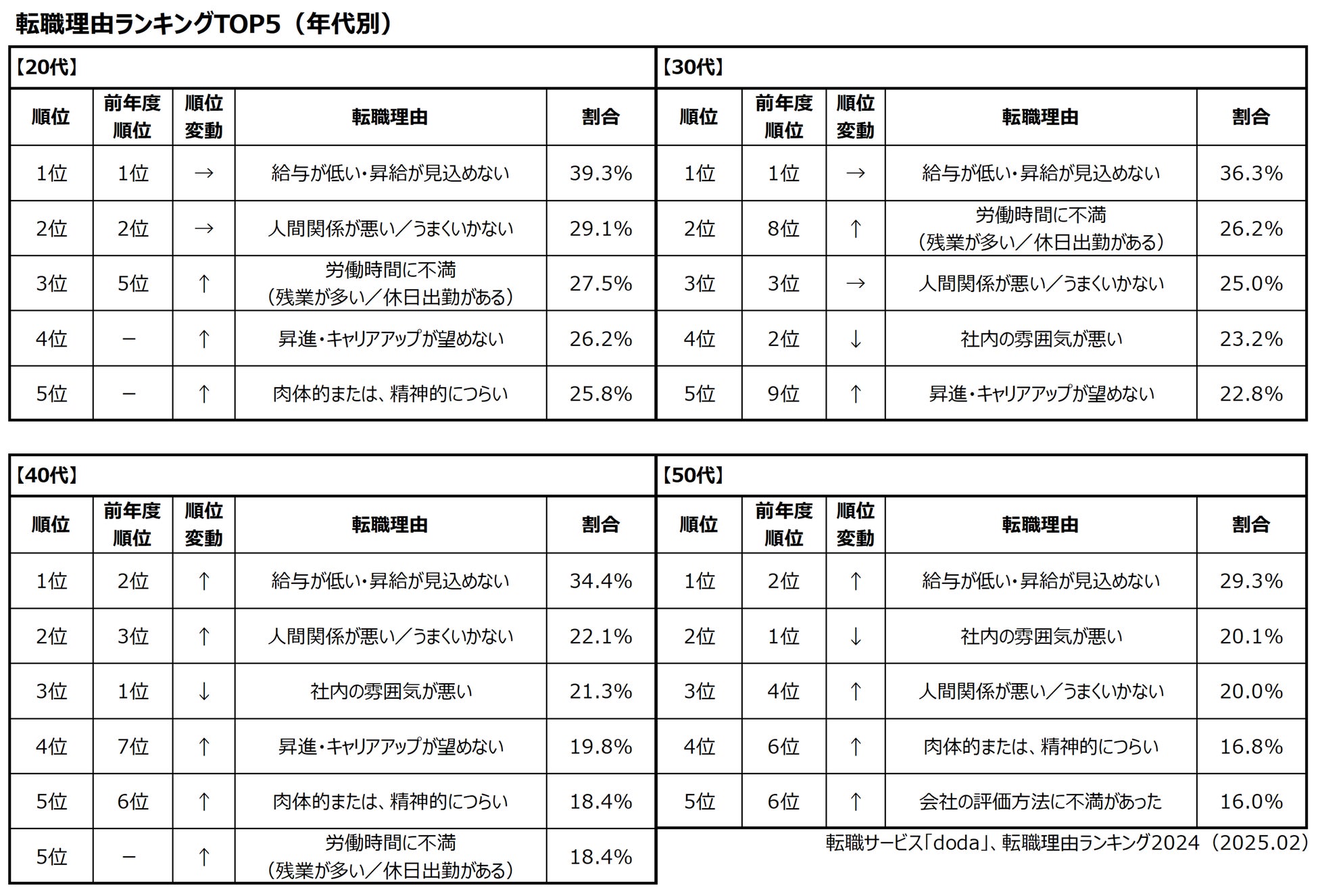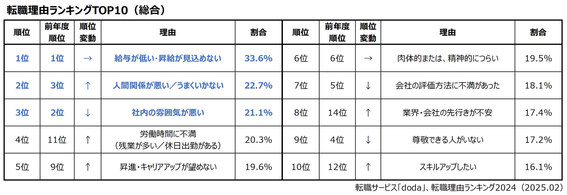 転職サービス「doda」、「転職理由ランキング最新版」を発表 転職理由1位は、4年連続で「給与が低い・昇給が見込めない」 2位、3位は人間関係に関する理由がランクイン