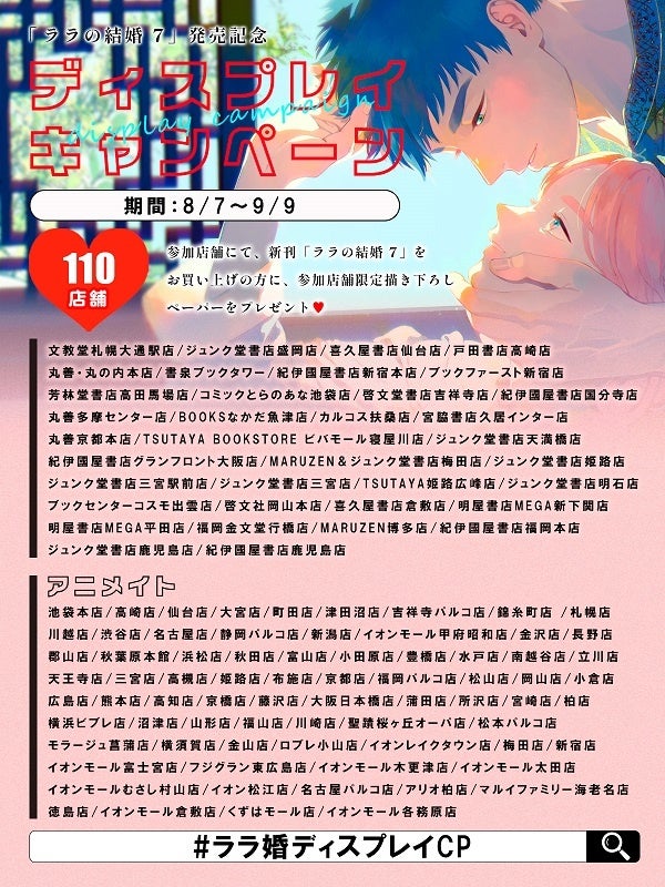 「ララの結婚 7」の発売を記念して、ディスプレイキャンペーンをアニメイト74店舗を含む、全国110店舗で開催いたします♪
