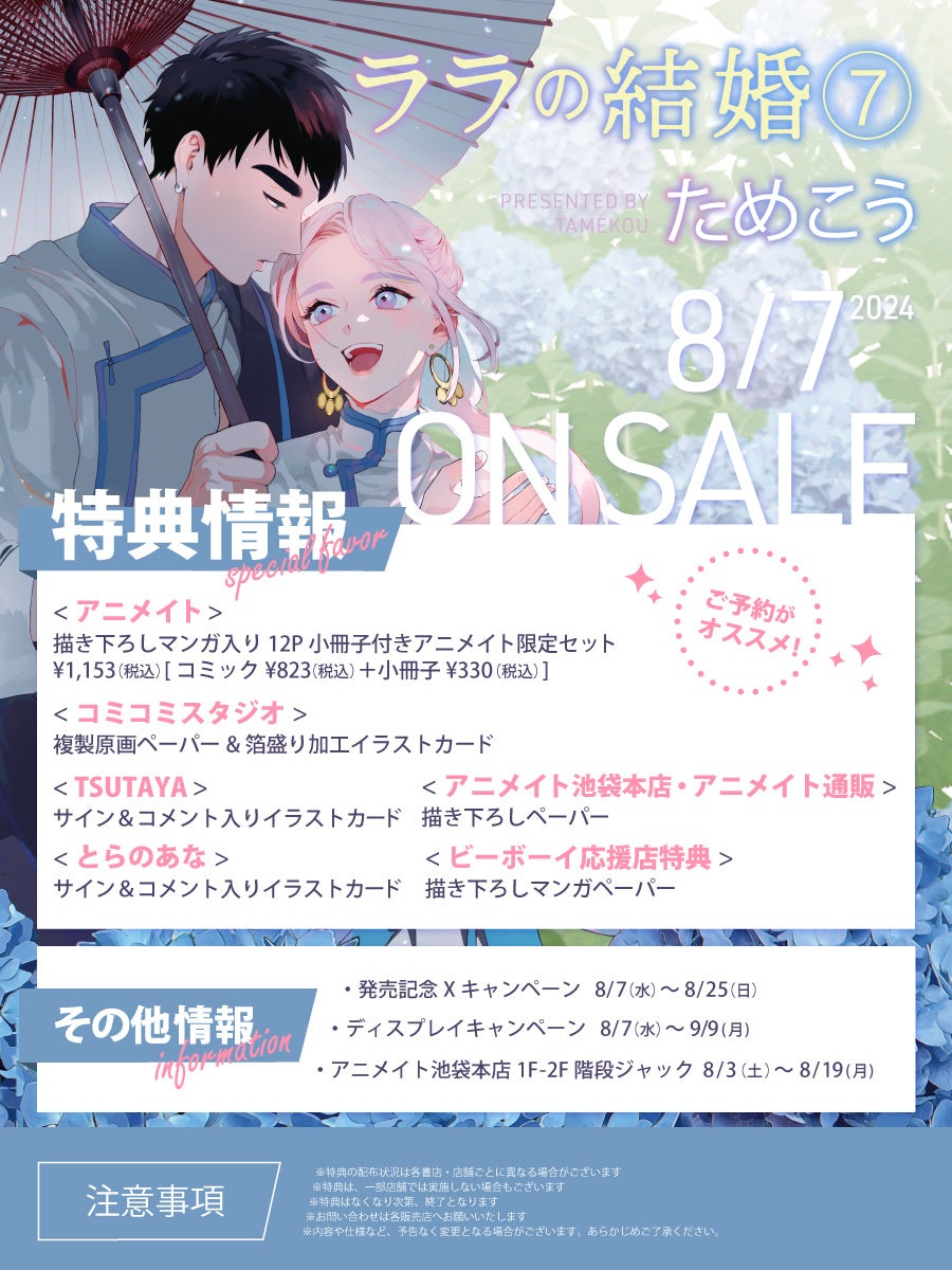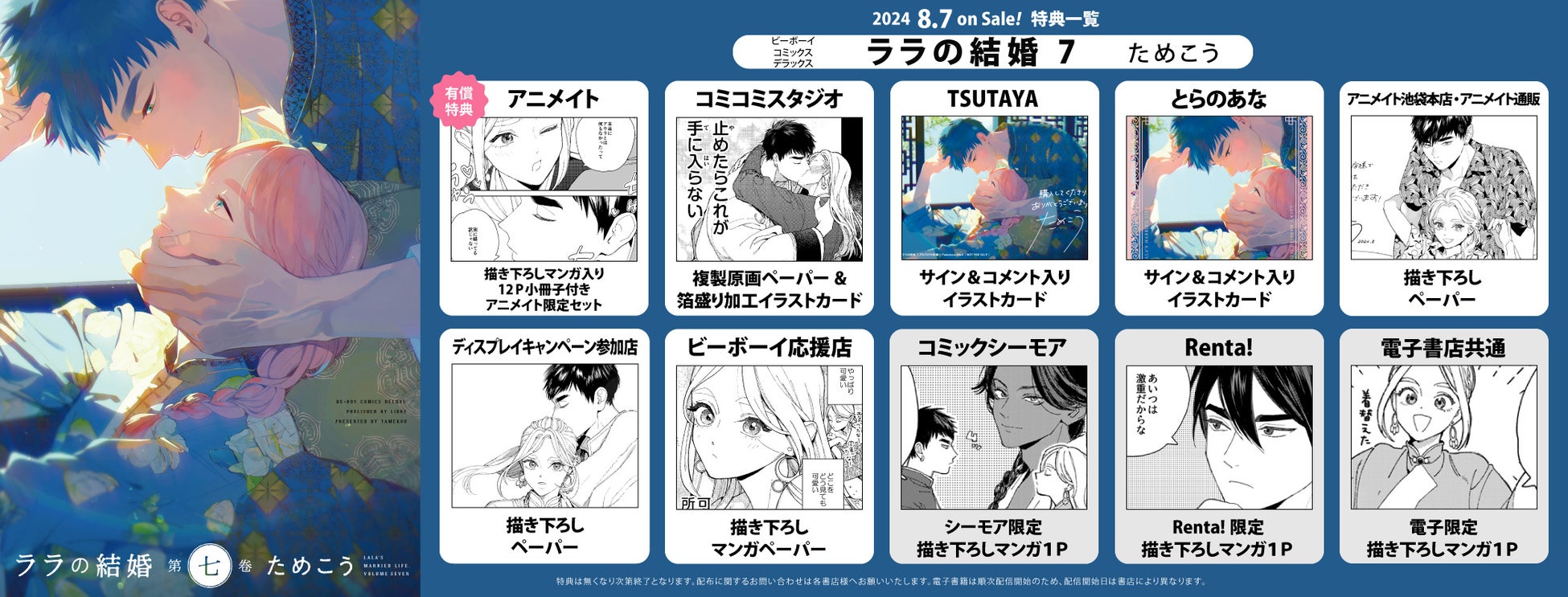 8/7~9/9の間 店頭ディスプレイ参加店で「ララの結婚 7」をご購入いただくと、ディスプレイキャンペーン参加店限定の描き下ろしペーパーがもらえます。