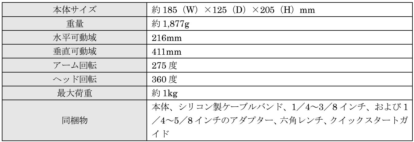 ・マイクやカメラ、照明などの機器を気軽にデスクに配置できるコンパクトなマウントアーム