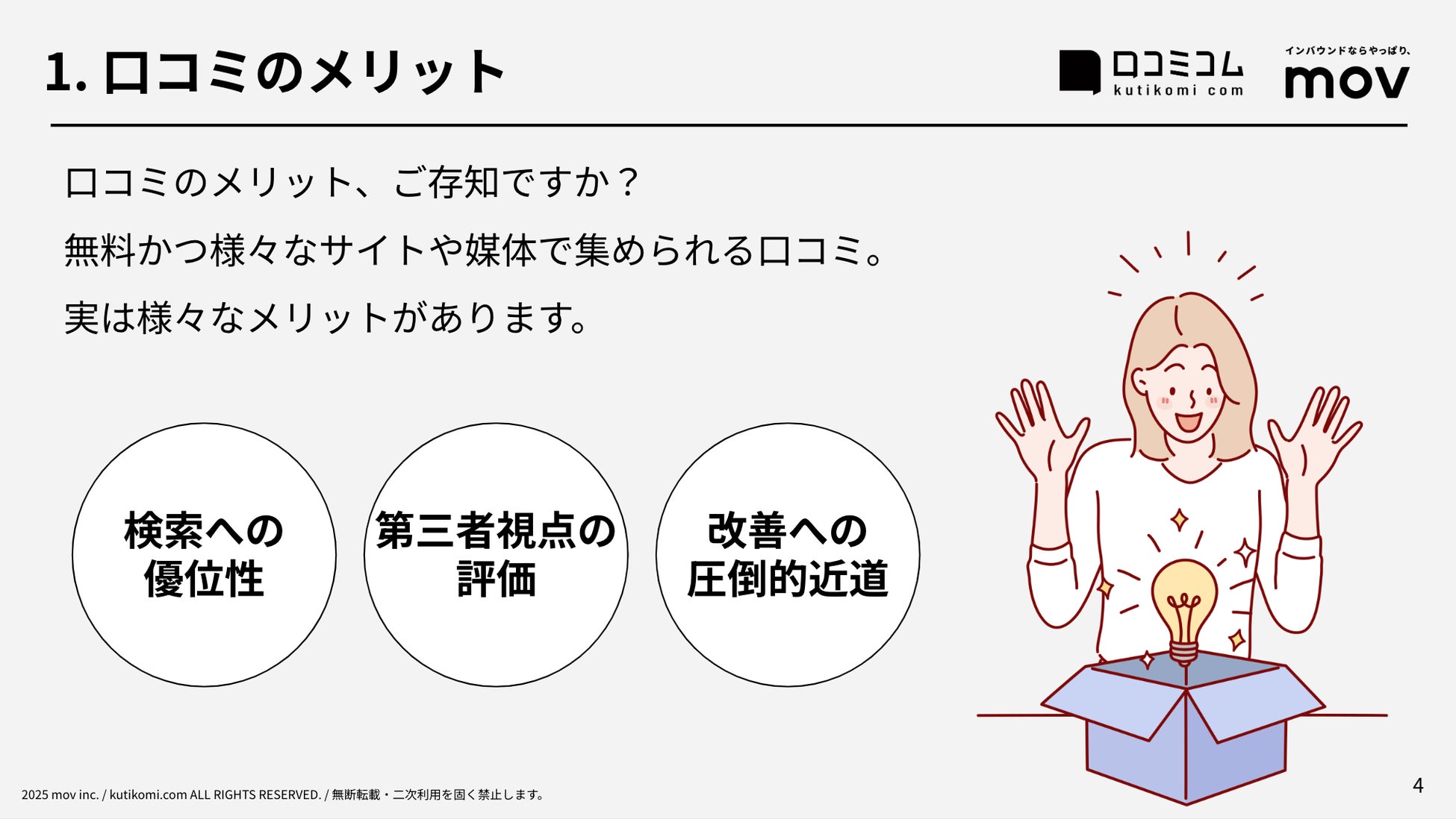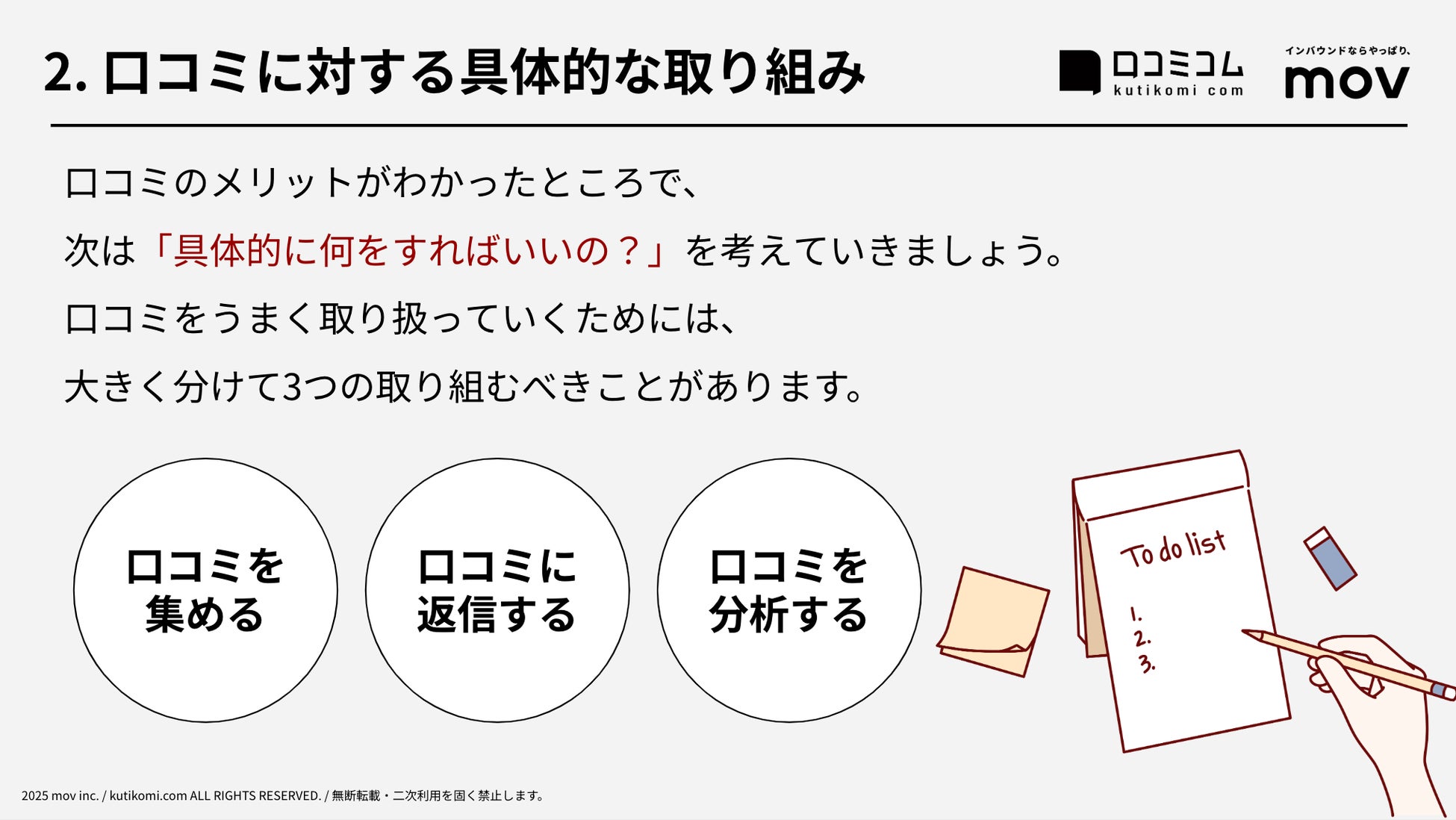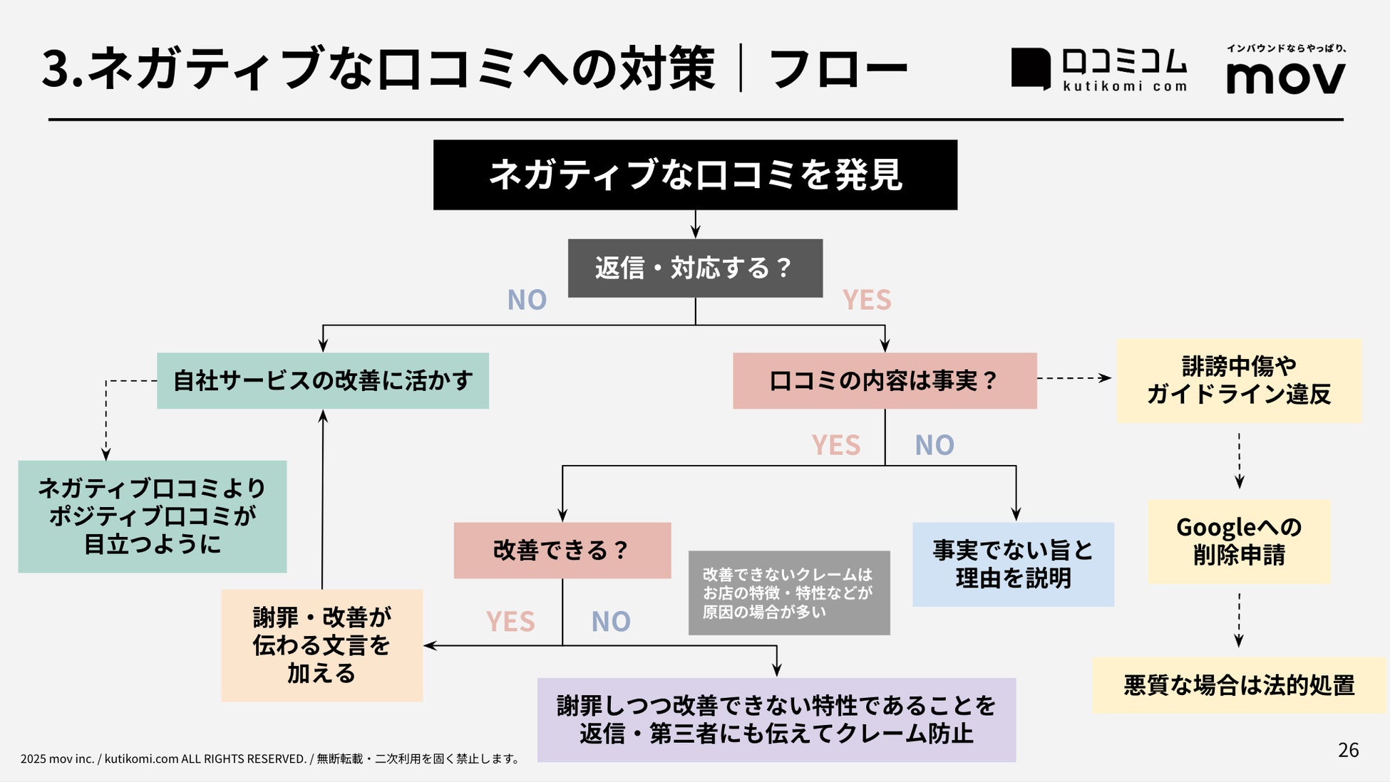 業界最大級のインバウンドビジネスメディア「訪日ラボ」及び 店舗向け集客一元化プラットフォーム「口コミコム」を運営する株式会社mov(本社:東京都渋谷区、代表取締役:渡邊 誠)は、口コミ管理ツール「口コミコム」の知見をもとに、GoogleマップやSNS、口コミサイト上での対応方法をまとめた『【2025年】口コミ対策ガイド』を2025年3月より無料公開しました。
