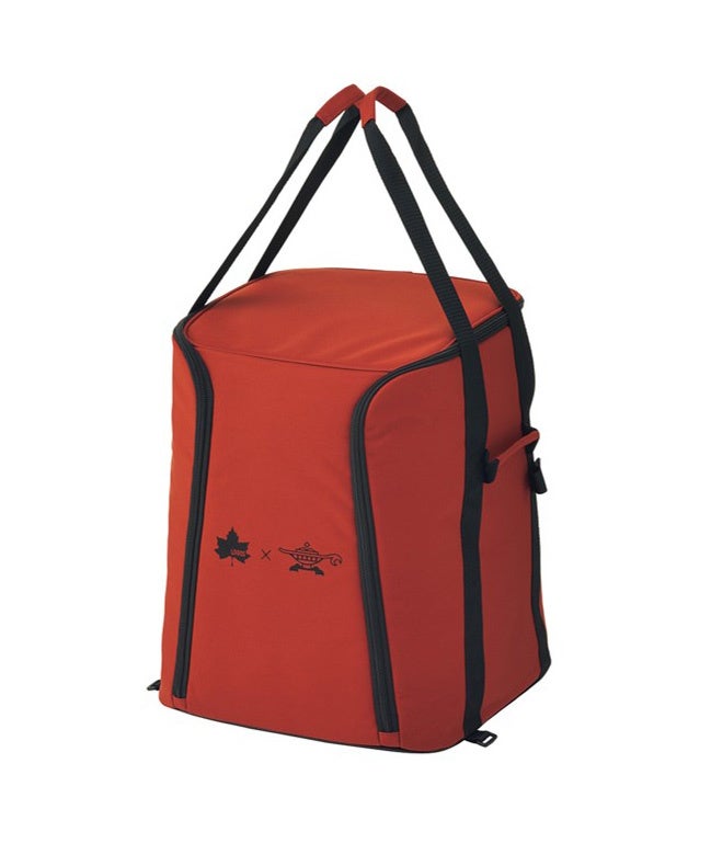 運搬に便利な専用バッグ「LOGOS×SENGOKU ALADDIN ヒーターガードキャリー・ポータブル」も別売りで販売。表地には難燃性生地を採用し、ケース全面にはフォームが入っているので外部からの衝撃を緩和。ストーブ使用時は、折り畳んで省スペースに収納可能で、保管時にはストーブを汚れやホコリから保護。