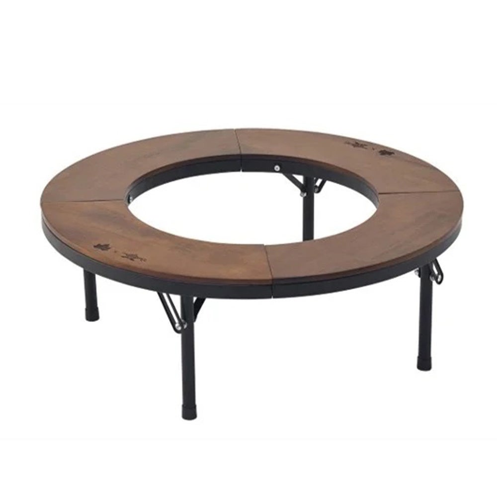 別売りの木製天板の円形テーブル、「LOGOS×ALADDIN ストーブテーブル」と組み合わせてカスタマイズも楽しめる。暖を取りながらお食事を楽しむことはもちろん、やけど防止の安全ガードとしても役立つ。