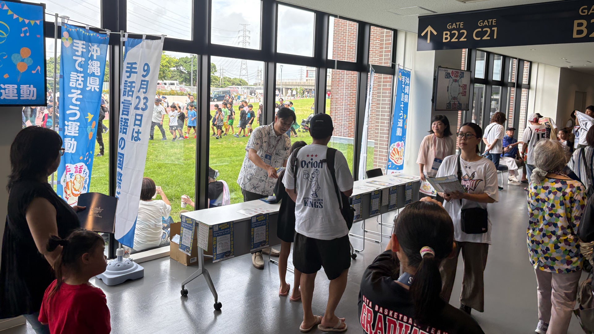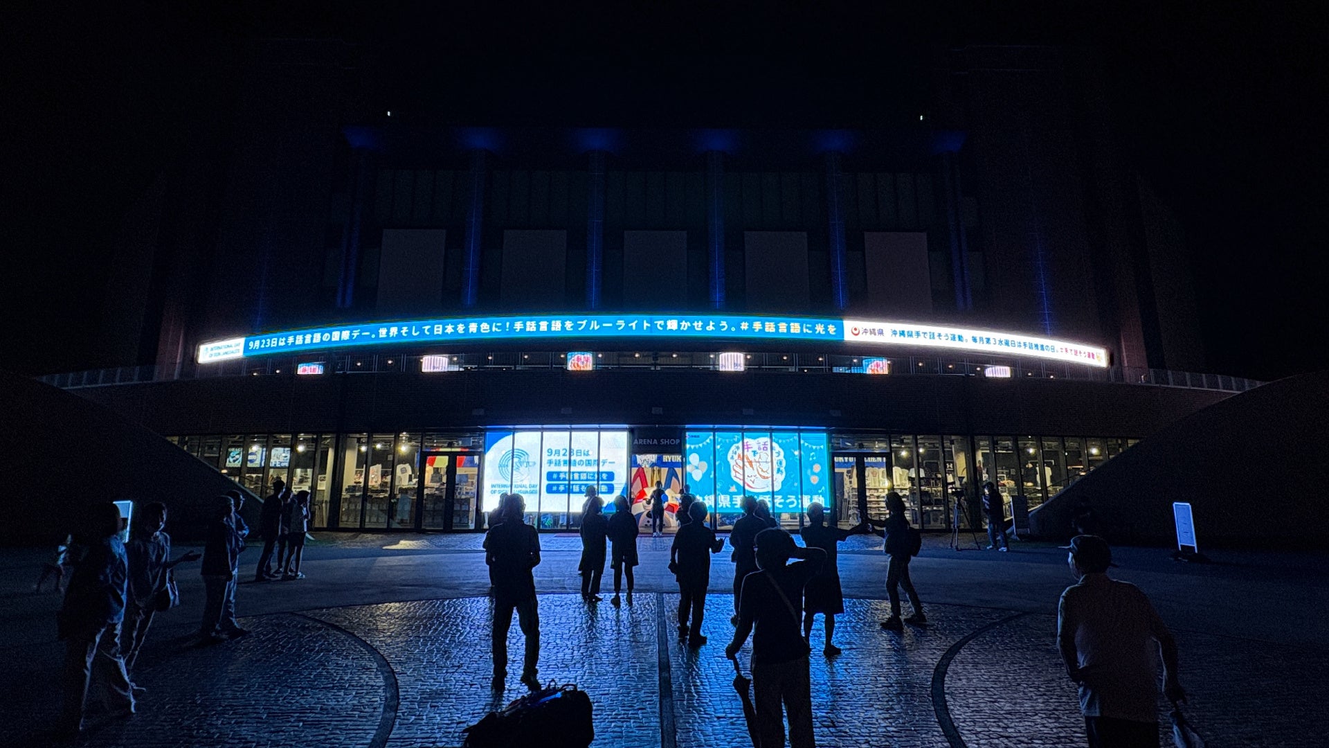 また、日没後には沖縄アリーナを青色にライトアップし、ウェルカムビジョンには「9月23日は手話言語の国際デー」のメッセージが映し出されました。