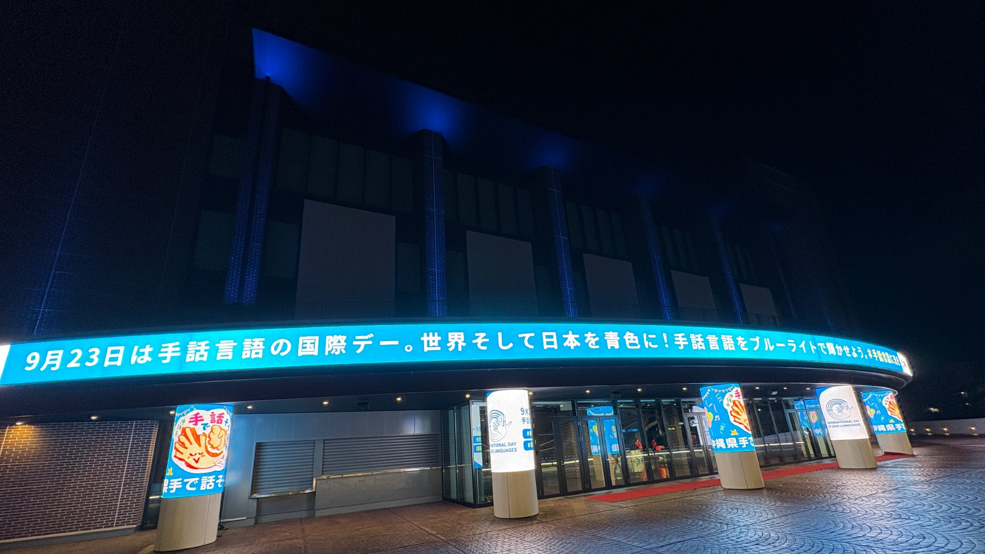 沖縄アリーナのメインエントランスを、世界ろう連盟のロゴの色であり「世界平和」を表す青色でライトアップし、手話言語の国際デーを広く周知しました。