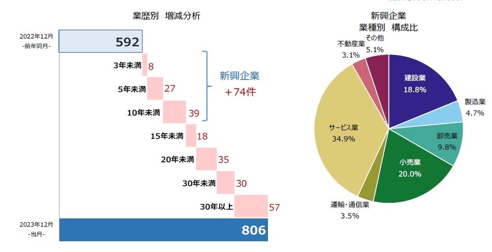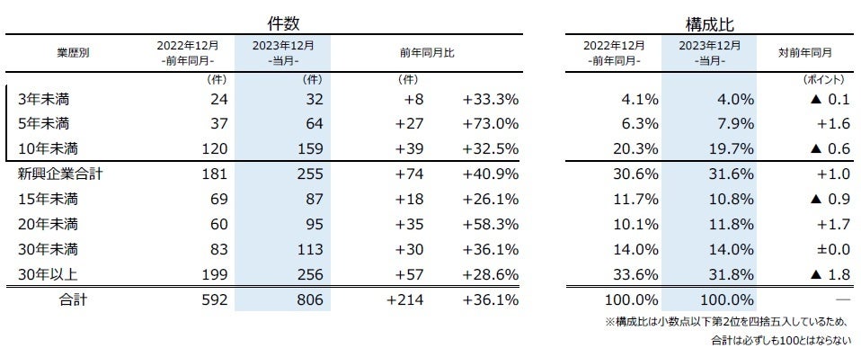 業歴別にみると、「30年以上」が最多。『新興企業』は22カ月連続で前年同月を上回った