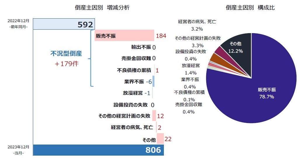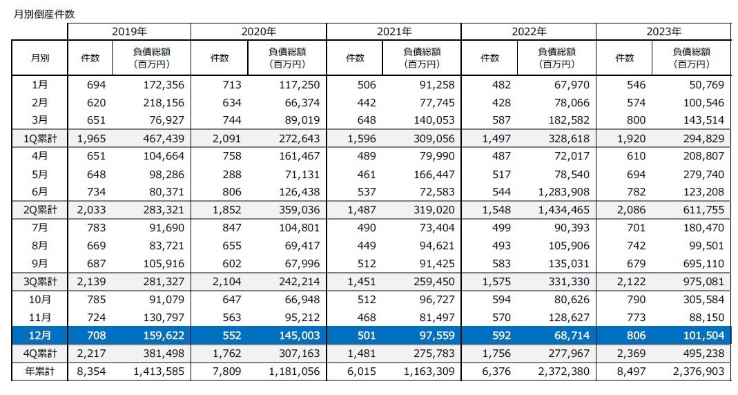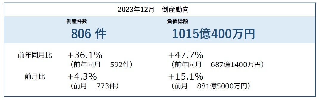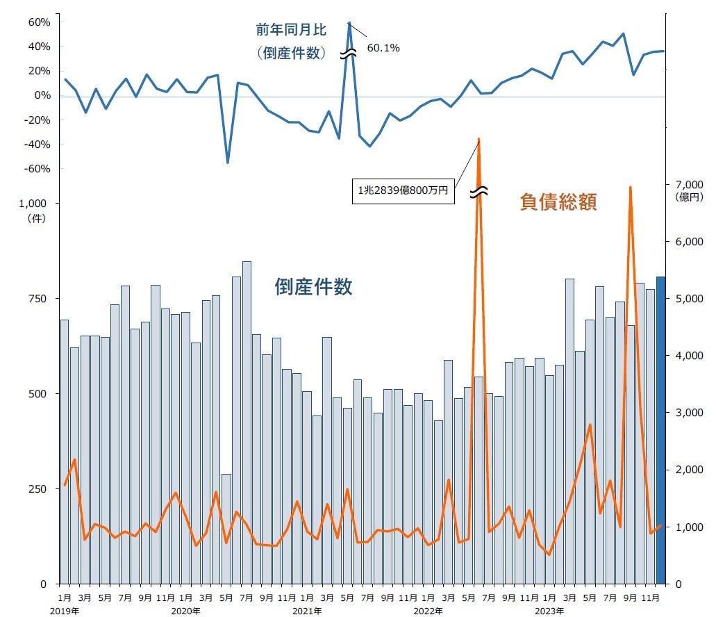 企業倒産は806件、2023年で最も多く 20カ月連続で前年同月を上回る ― 全国企業倒産集計2023年12月報