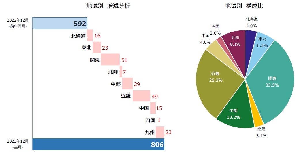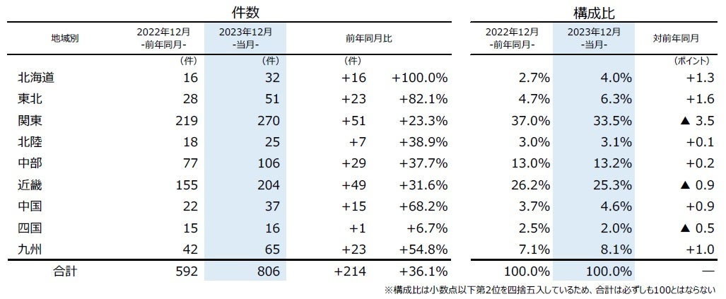 地域別にみると、全9地域で前年同月を上回った。『北海道』(前年同月16件→32件、100.0%増)、『東北』(同28件→51件、82.1%増)が2023年で最多件数となった