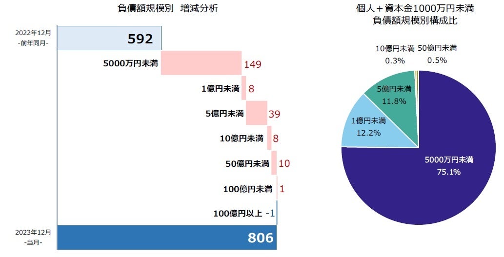 負債規模別にみると、「5000万円未満」が505件(前年同月356件、41.9%増)で最も多く、「5億円未満」が155件(同116件、33.6%増)で続いた。中小・零細企業の倒産が目立つ一方、「50億円未満」が18件(同8件、125.0%増)と、前年同月から倍増した。