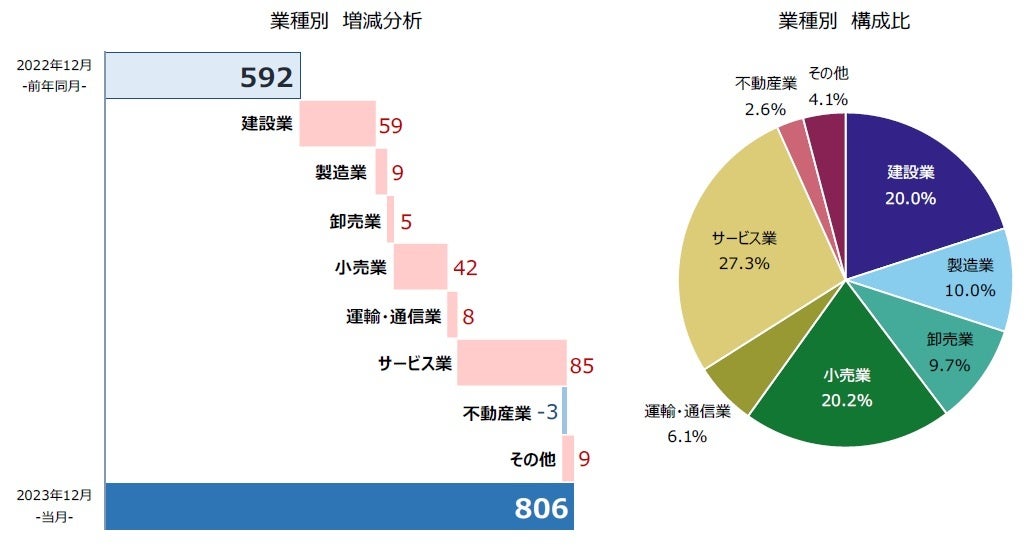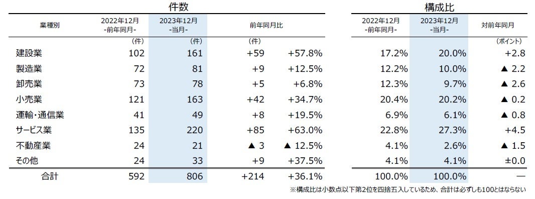 業種別にみると、7業種中6業種で前年同月を上回った。『サービス業』(前年同月135件→220件、63.0%増)が最も多く、『小売業』(同121件→163件、34.7%増)、『建設業』(同102件→161件、57.8%増)が続いた。『サービス業』は、リーマン・ショック後の2009年6月(242件)、同年7月(227件)に次ぐ過去3番目の高水準。『運輸・通信業』(同41件→49件、19.5%増)も、12月としては2008年12月(52件)に次ぐ2番目の高水準となった。