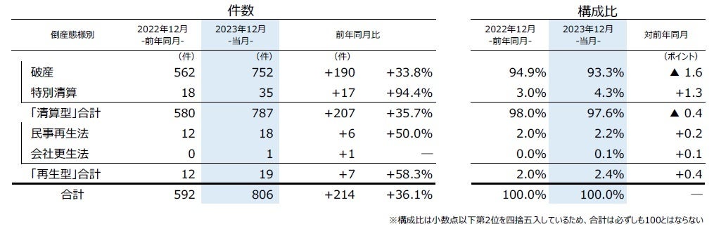 倒産態様別にみると、『清算型』倒産の合計は787件(前年同月580件、35.7%増)となり、全体の97.6%(対前年同月0.4ポイント減)を占めた。『再生型』倒産は19件(同12件、58.3%増)発生し、2カ月ぶりに前年同月を上回った。
