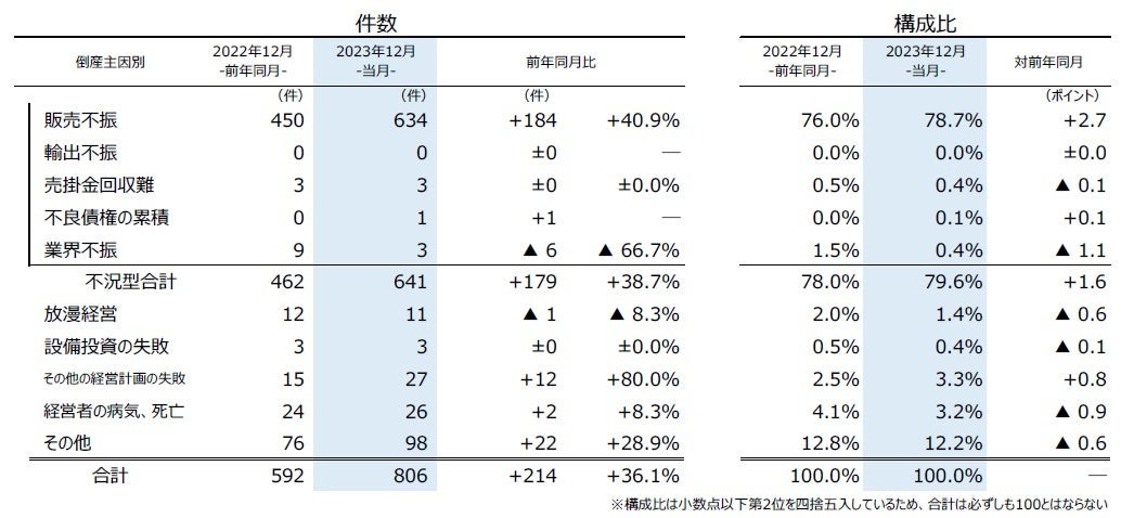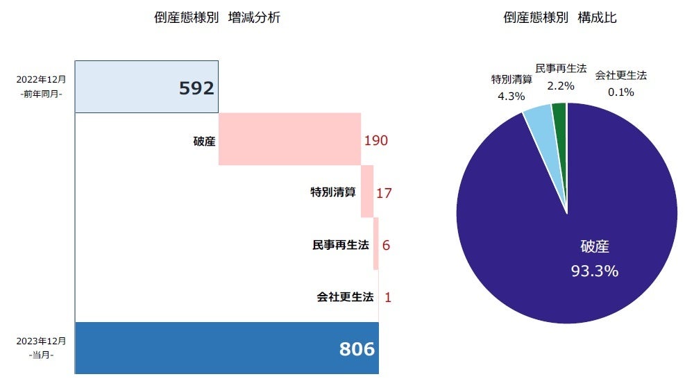 倒産件数は806件(前年同月592件、36.1%増)と、20カ月連続で前年同月を上回った。2023年3月(800件)を上回り、2023年で最多となった。コロナ支援策の縮小に加え、物価高等によるコスト増もあり、年末にかけて倒産が急増した