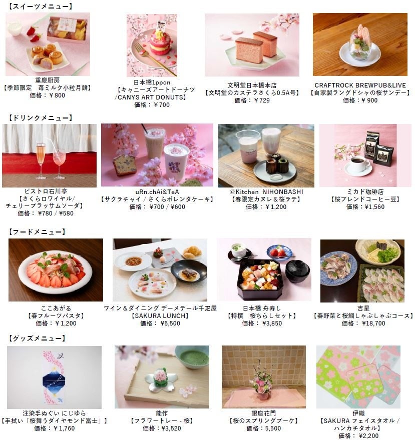日本橋エリアの約240店舗が、“桜”をテーマにしたこの春限定のメニューを展開します。見た目も華やかなスイーツ、軽食、お弁当、ドリンクなど、春を味わうのにぴったりの品々をお楽しみください。