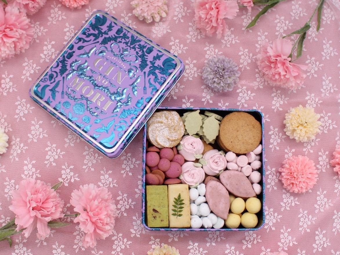 宝石箱の様なクッキープティボワの母の日限定のクッキー缶。中央のカーネーションのメレンゲが華やかな彩り、バラを練り込んだクッキーなど香りや味、見た目も彩り豊かなクッキーの詰め合わせです。販売期間:4月26日~5月11日