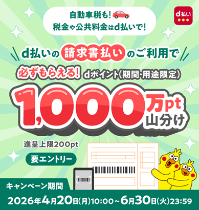 株式会社 NTTドコモ(以下、ドコモ)は、「d払い請求書払いのご利用で1,000万ポイント山分けキャンペーン(以下、本キャンペーン)」を、 2026年4月20日(月)から2026年6月30日(火)までの期間で開催します。