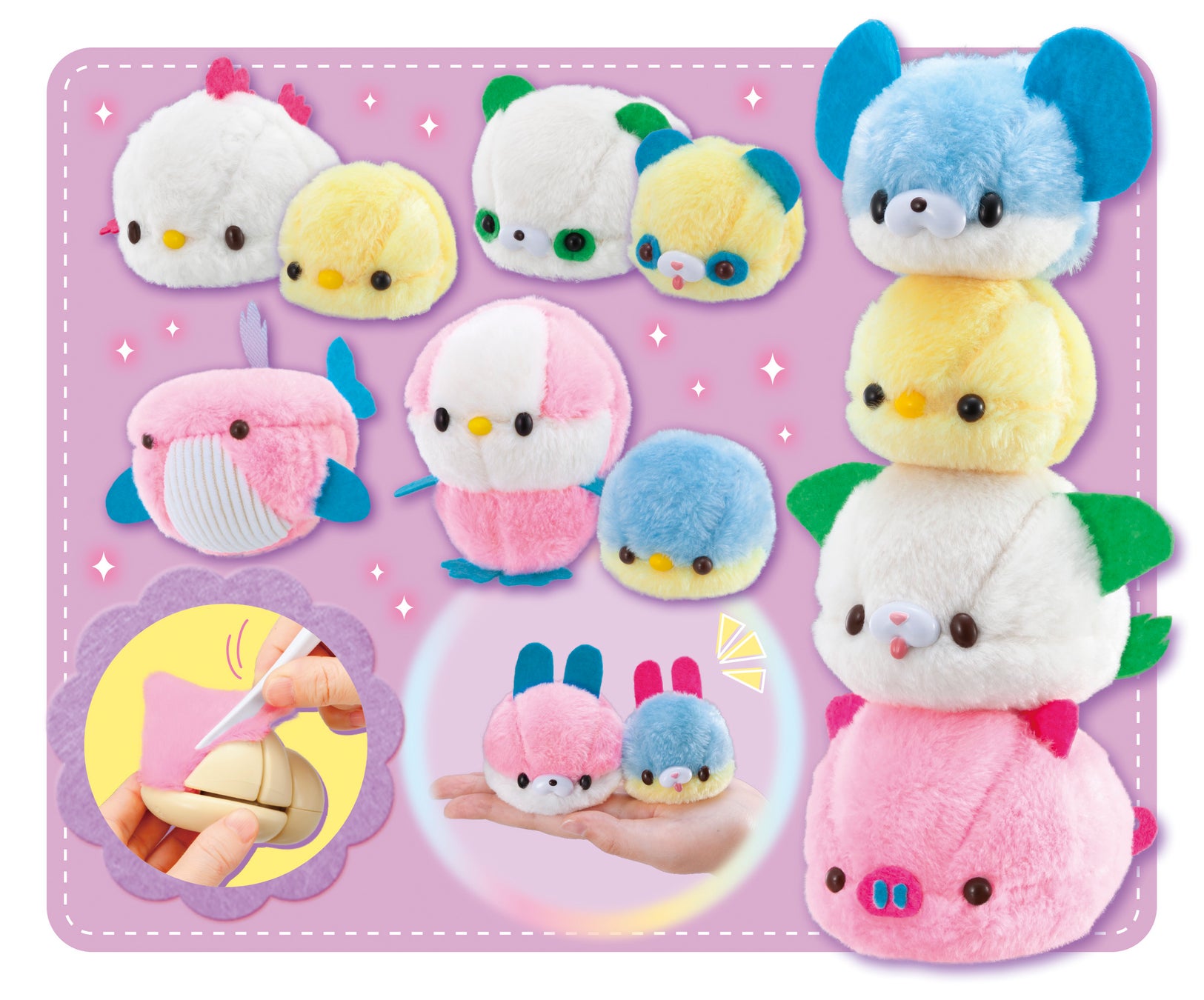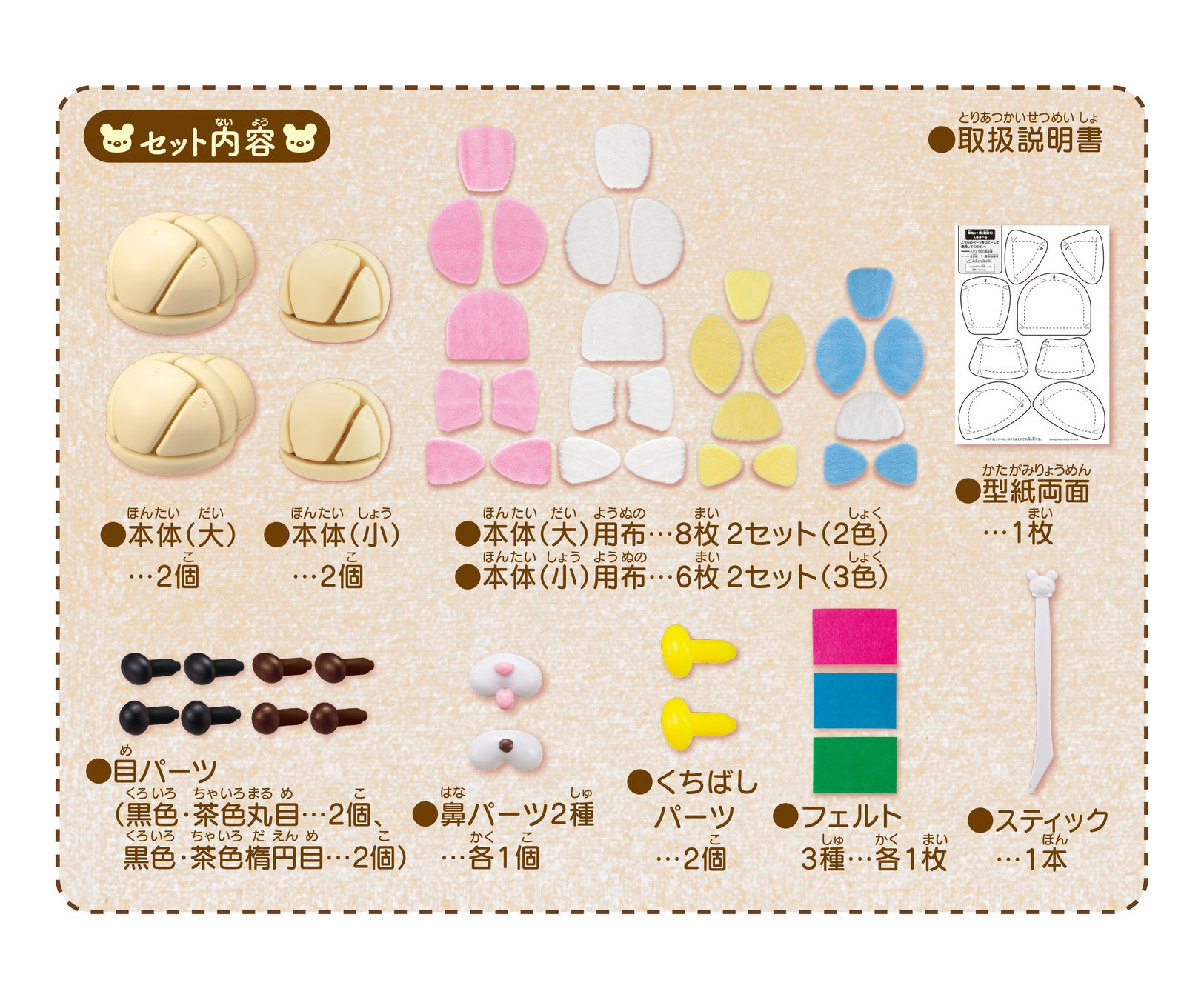 本商品は、本体に同梱されている布をスティックで押し込むだけで、針と糸も使わずに簡単に可愛い大きさの違う大小2種類のマスコットを作ることができるクラフトホビー商品です。セット内容は、マスコットの本体が大小各2個、数種類の布・フェルト・目・鼻・くちばしパーツで、組み合わせると約1,000通り以上のアレンジが可能になります。