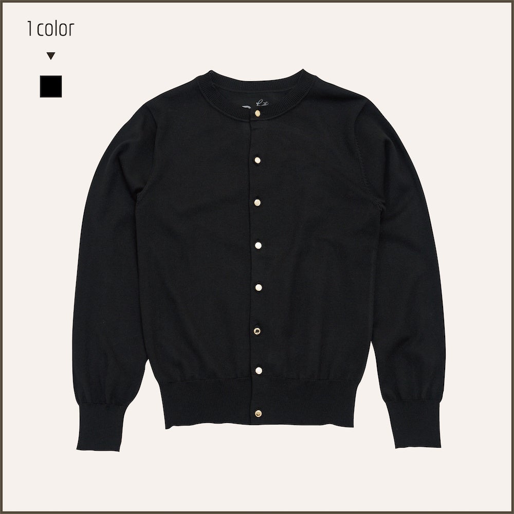 知的さのあるブラックのカーディガンは、ゴールドボタンがポイント。お仕事着から、普段着まで幅広いシーンで活躍します。