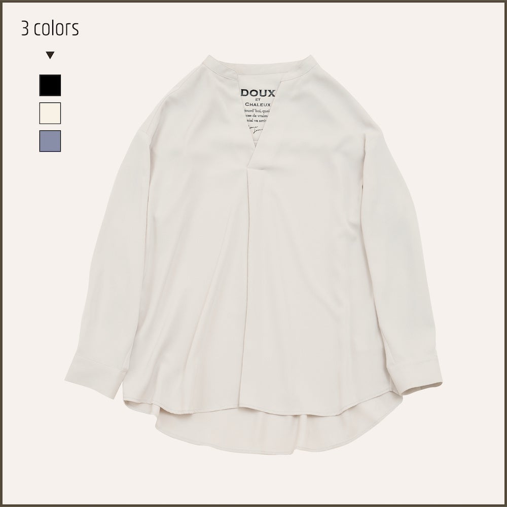胸元がV字に開いたデザインで首や顔周りをすっきりと見せるスキッパーブラウスは、タック入りで体型を拾わないシルエットもうれしい。
