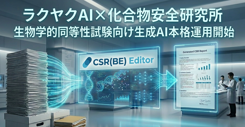 今回、この高精度な「ラクヤクAI」の技術基盤を生物学的同等性試験の領域にも拡張しました。化合物安全性研究所との強力なパートナーシップのもとで専用のCSRエディタの開発を進め、実運用に耐えうる水準に到達したため、2026年4月16日より、今期受託予定の試験に対する本格運用を開始いたします。