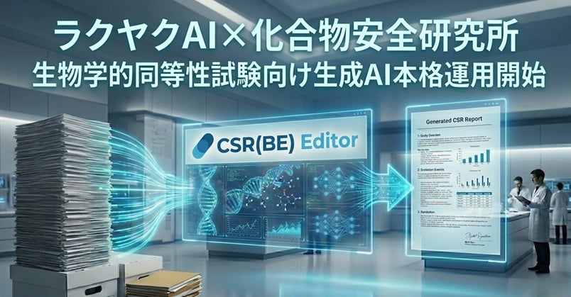 株式会社メタリアル(本社:東京都千代田区、代表取締役:五石順一)グループで、国内市場No.1※のAI翻訳サービス及び製薬ドキュメント専門AI「ラクヤクAI」を開発・提供する株式会社ロゼッタ(代表取締役:五石 順一)は、株式会社化合物安全性研究所(参考:https://www.ka-anken.co.jp/)と共同で進めてきた、生成AIによる生物学的同等性試験向け治験総括報告書(CSR)自動作成ツール「CSR(BE)エディタ」の開発フェーズを完了し、2026年4月16日より本格的な運用フェーズへと移行することをお知らせいたします。
