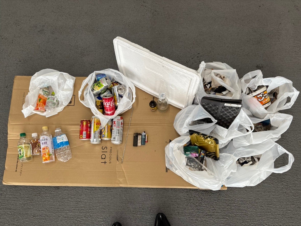 終了後に職員が分別と計量を行ったところ、可燃ごみが2,500g、ビン・缶がそれぞれ600g、ペットボトルが280g、不燃ごみが150gという結果でした。ごみ拾いの最中には、それ以外に不法投棄されたパソコン用モニター(約20kg)も見つかり、改めて一人ひとりの注意でごみを減らせる現状を目の当たりにしました。