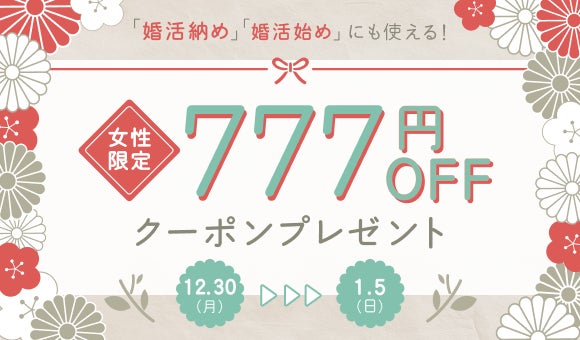 年末年始など長期連休は、帰省により両親や親族から「結婚を急かされた」経験があると回答される方が多く²、婚活意欲が高まる傾向にあります。そこでIBJマッチングでは、年末年始のキャンペーンとして『777円OFFクーポン』を配布し「新しい年を迎える前に素敵なご縁を見つけたい」「年末年始の休み期間に出会いを探したい」皆様を応援いたします!