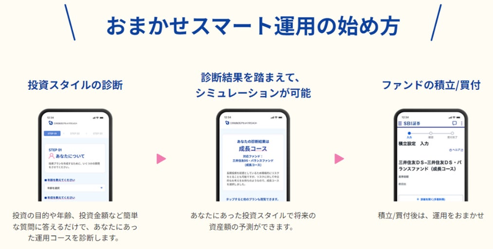 株式会社SBI証券(本社:東京都港区、代表取締役社長:髙村正人、以下「当社」)は、2025年2月28日(金)より、個人のお客さまのさらなる資産形成の一助となるべく、 三井住友DSアセットマネジメント株式会社(本社:東京都港区、代表取締役社長 兼 CEO:猿田隆、以下「三井住友DSアセットマネジメント」)の提供するロボアドバイザー付バランス型ファンドを活用した「おまかせスマート運用」(以下、「本サービス」)の提供を開始します。