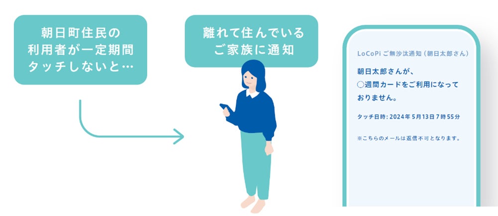 また、高齢者のカードタッチが一定期間無かった場合に通知が届く「ごぶさたメール」のサービス利用も可能です。離れて暮らしている家族の生活の異変に気づくことができる仕組みです。(見守り対象高齢者の家族が町外在住の場合も利用・登録が可能)