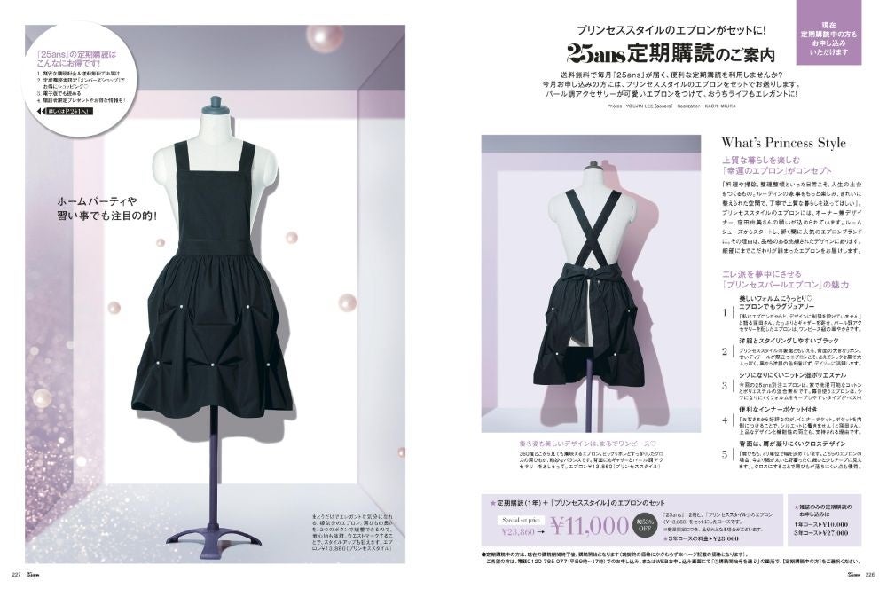 送料無料で毎月『25ans』が届く、便利な定期購読を利用しませんか?今お申し込みの方には、「プリンセススタイル」のエプロン(¥13,860)がセットに。360度どこから見ても美しく、ギャザーやパール調アクセサリーがエレガントな気分を盛り上げるエプロン。ビッグリボンとすっきりとしたクロスの肩ひもが絶妙なバランスで、後ろ姿も華やか。肩ひもの長さは3つのボタンで調整でき、便利なインナーポケット付き。細部にまでこだわった姫エプロンで、ホームパーティや習い事でも注目の的!