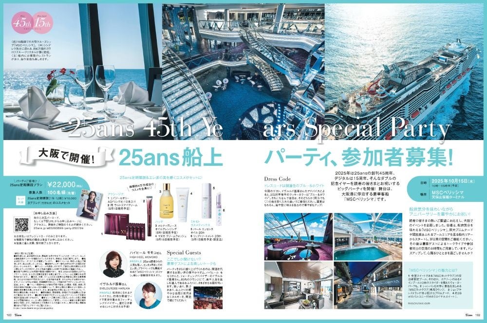 2025年は25ansの創刊45周年、デジタルは15周年。そんなダブルの記念イヤーを読者の皆さまとお祝いするビッグパーティを、今度は大阪で開催!舞台は、大阪港に停泊する豪華客船「MSCベリッシマ」。巨大プロムナードや開放感あふれるプールエリアを巡る船内ツアーや豪華ゲストによるトークライブ、参加者同士の交流タイムなど、非日常の空間をご堪能ください。