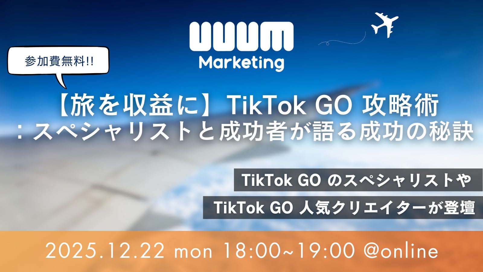 UUUMマーケティング株式会社(本社:東京都港区、代表取締役 社長執行役員:鈴木 司)は、ウェビナー「【旅を収益に】TikTok GO攻略術:スペシャリストと成功者が語る成功の秘訣」を、2025年12月22日(月)18:00〜19:00に開催します。