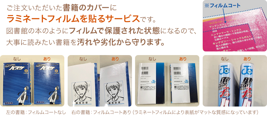 honto本の通販ストアでは、ご注文いただいた書籍の表紙にラミネートフィルムを貼るサービスを提供しています。図書館の本のようにフィルムで保護された状態になるので、大事に読みたい書籍を汚れや劣化から守ります。