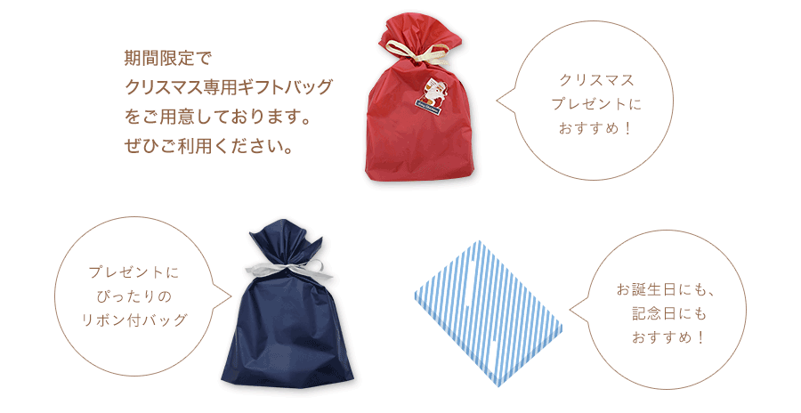 ※クリスマス専用ギフトバッグをご選択の場合、商品の手配状況によりシーズン期間を過ぎてからの出荷となることがございます。ラッピングバッグに入らない商品の場合は、ラッピング用紙でのお包みとなります。