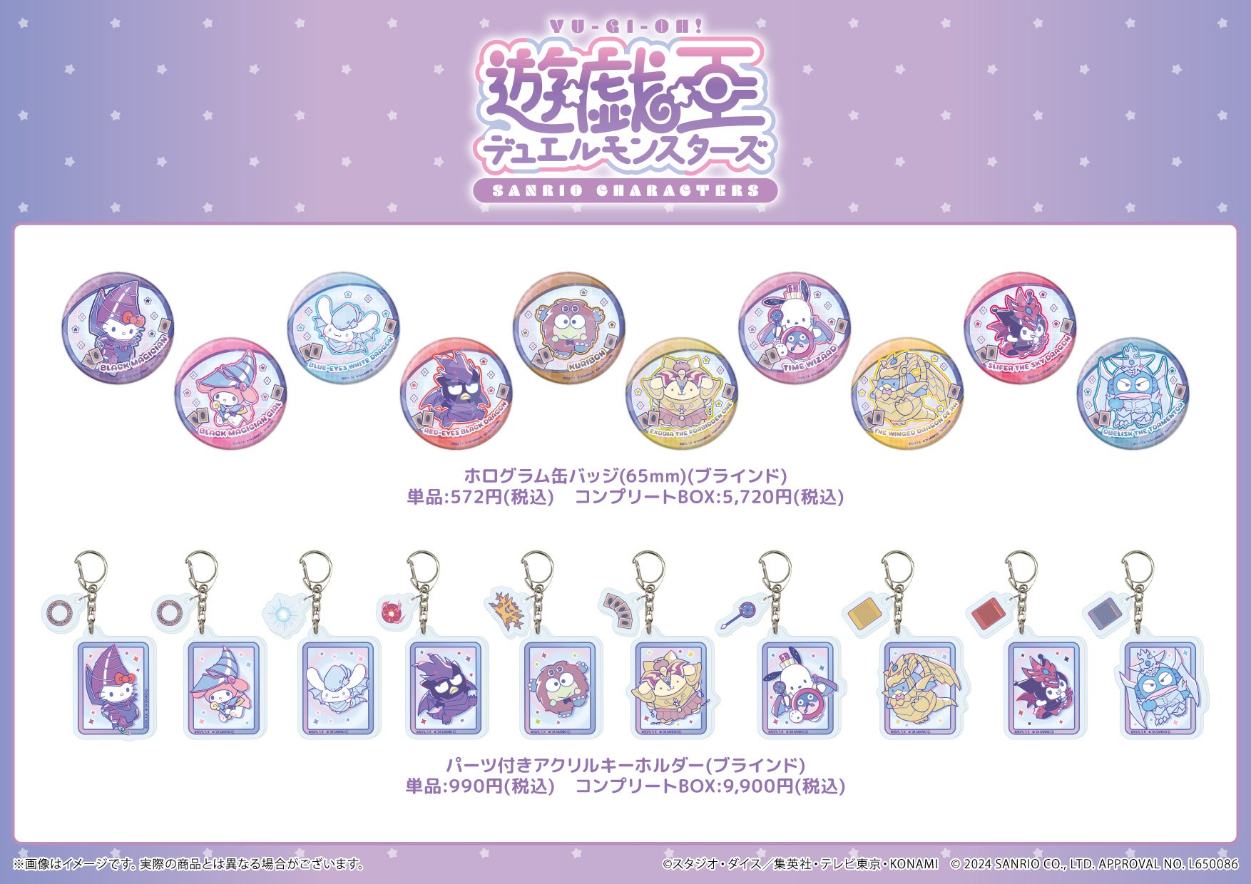 ブラック・マジシャン×ハローキティ/ブラック・マジシャン・ガール×マイメロディ/青眼の白龍×シナモロール/真紅眼の黒竜×バッドばつ丸/クリボー×けろけろけろっぴ/封印されしエクゾディア×ポムポムプリン/時の魔術師×ポチャッコ/ラーの翼神竜×タキシードサム/オシリスの天空竜×クロミ/オベリスクの巨神兵×ハンギョドン