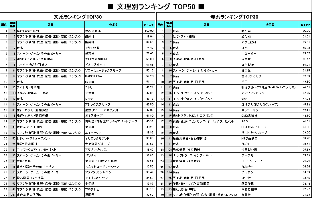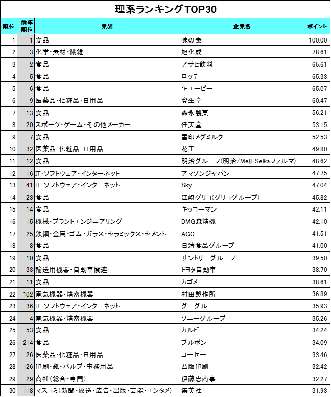 理系のトップは味の素。3位アサヒ飲料、4位ロッテ、5位キューピーなど、「食品」がトップ10に6社入りました。30位以内でも14社が「食品」となっており、人気の高さが伺えます。