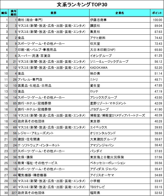 (1) 文系トップは伊藤忠商事。2位講談社、3位集英社など「マスコミ」が上位に