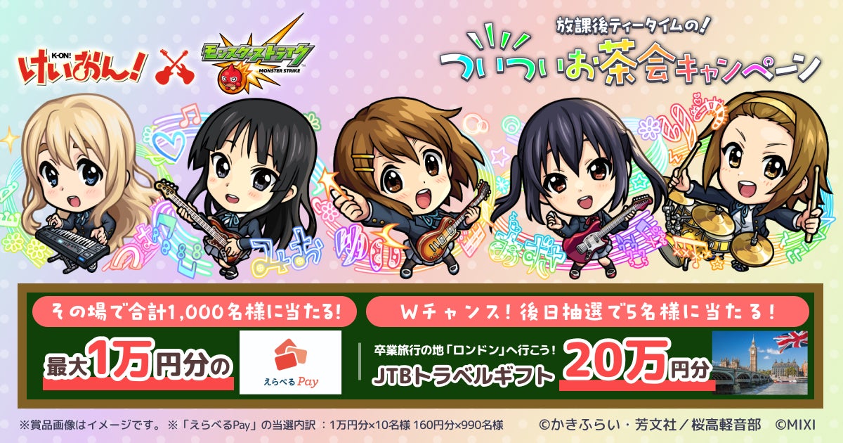 株式会社MIXI(東京都渋谷区、代表取締役社長 上級執行役員 CEO:木村 弘毅)は、スマホアプリのひっぱりハンティングRPG「モンスターストライク」(以下モンスト)において、アニメ『けいおん!』とのコラボを2026年4月26日(日)12:00より開催します。