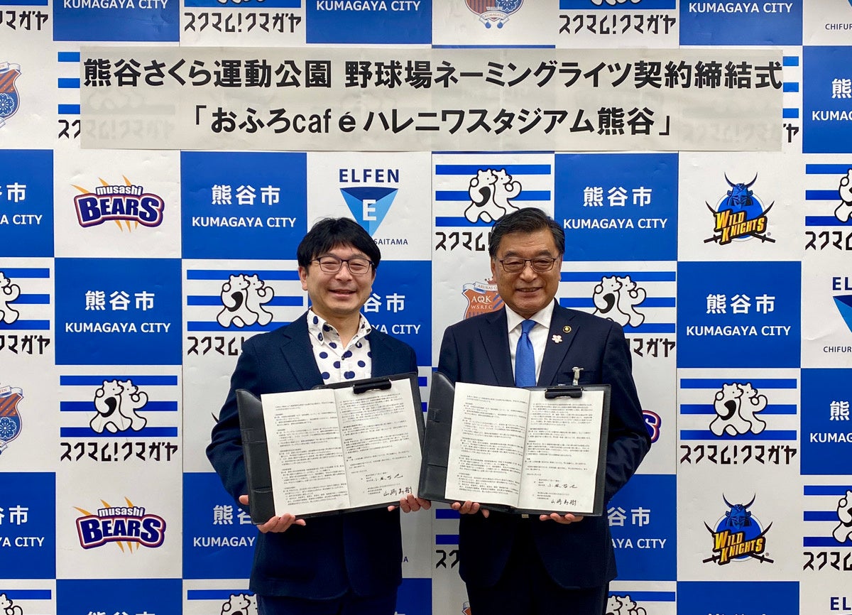 温泉道場は、熊谷に温浴施設「おふろcafe ハレニワの湯(埼玉県熊谷市久保島)」を運営。また、グループ企業で、プロ野球独立リーグに所属する球団「埼玉武蔵ヒートベアーズ」も運営しております。埼玉武蔵ヒートベアーズは、2024シーズン、同球場において13試合の実施を予定しています。熊谷市でのネーミングライツ導入は、本施設が初の事例となります。今回のネーミングライツを通じて、地域貢献・地域活性により一層力を入れてまいります。