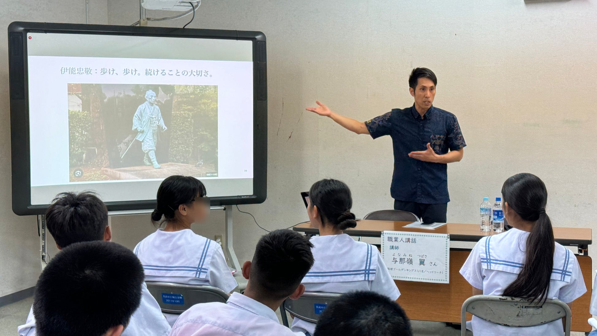 金武中学校の中学2年生を対象に行われた職業人講話では「素直さ」、「まずはやってみること」、「何かに夢中になること」など、コーチとして大切にしていることを自身の経験談を交えながら生徒たちへお話ししました。