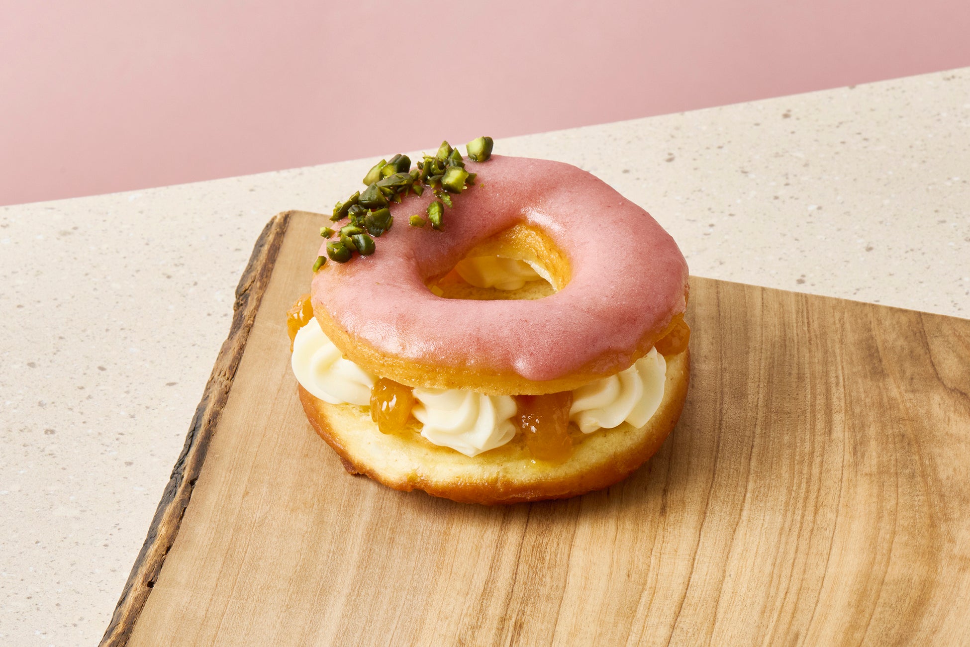 プラントベースのクリームチーズとオーガニックの桃ジャムをサンドして、色鮮やかな赤桃ピューレのグレーズをあわせました。華やかな桃の香りとチーズの酸味が夏にぴったりです。