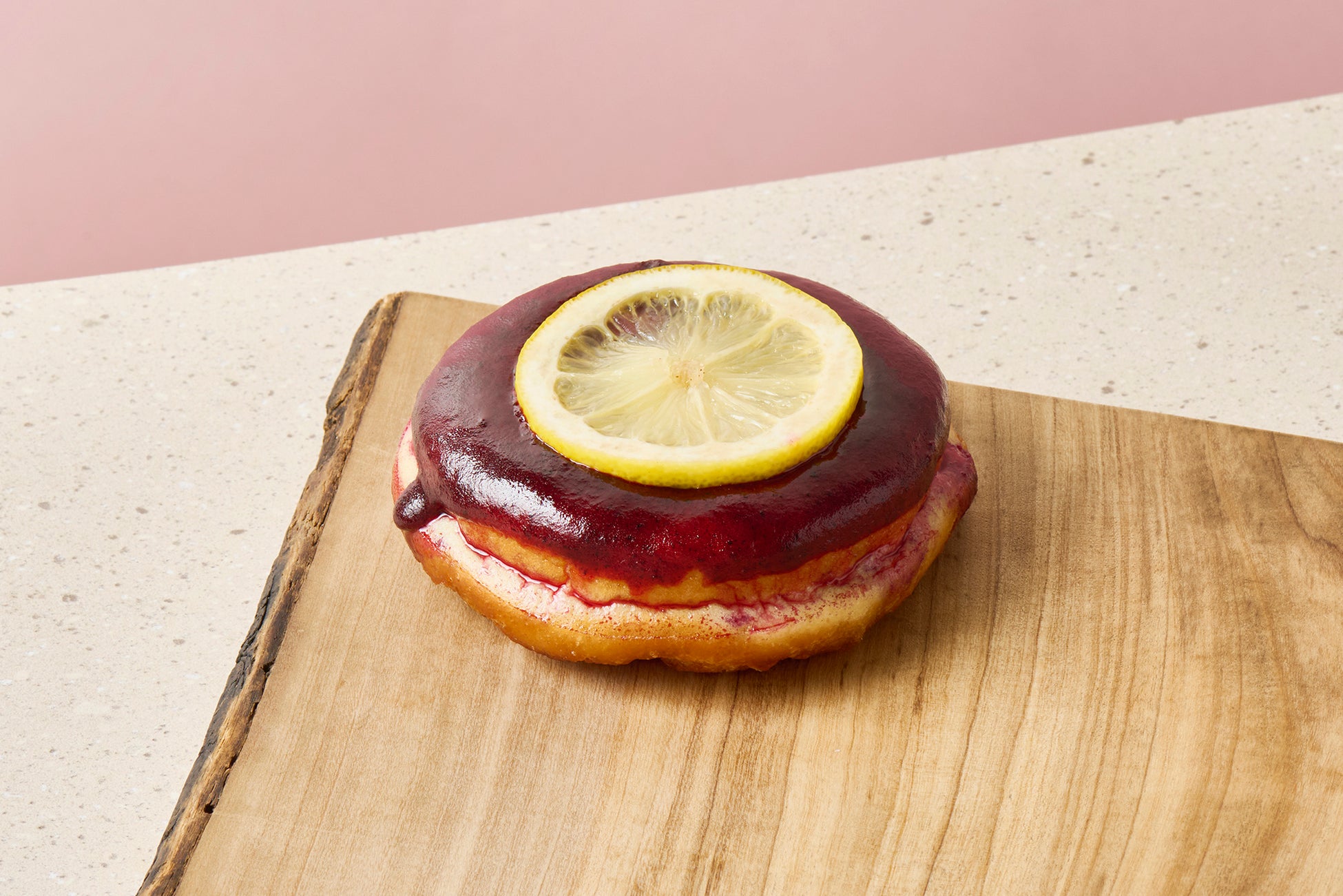 甘味のあるブルーベリーピューレと程よい酸味のレモン果汁のグレーズが、すっきりと爽やかなドーナツ。きび糖シロップに漬け込んだレモンスライスをトッピングしました。