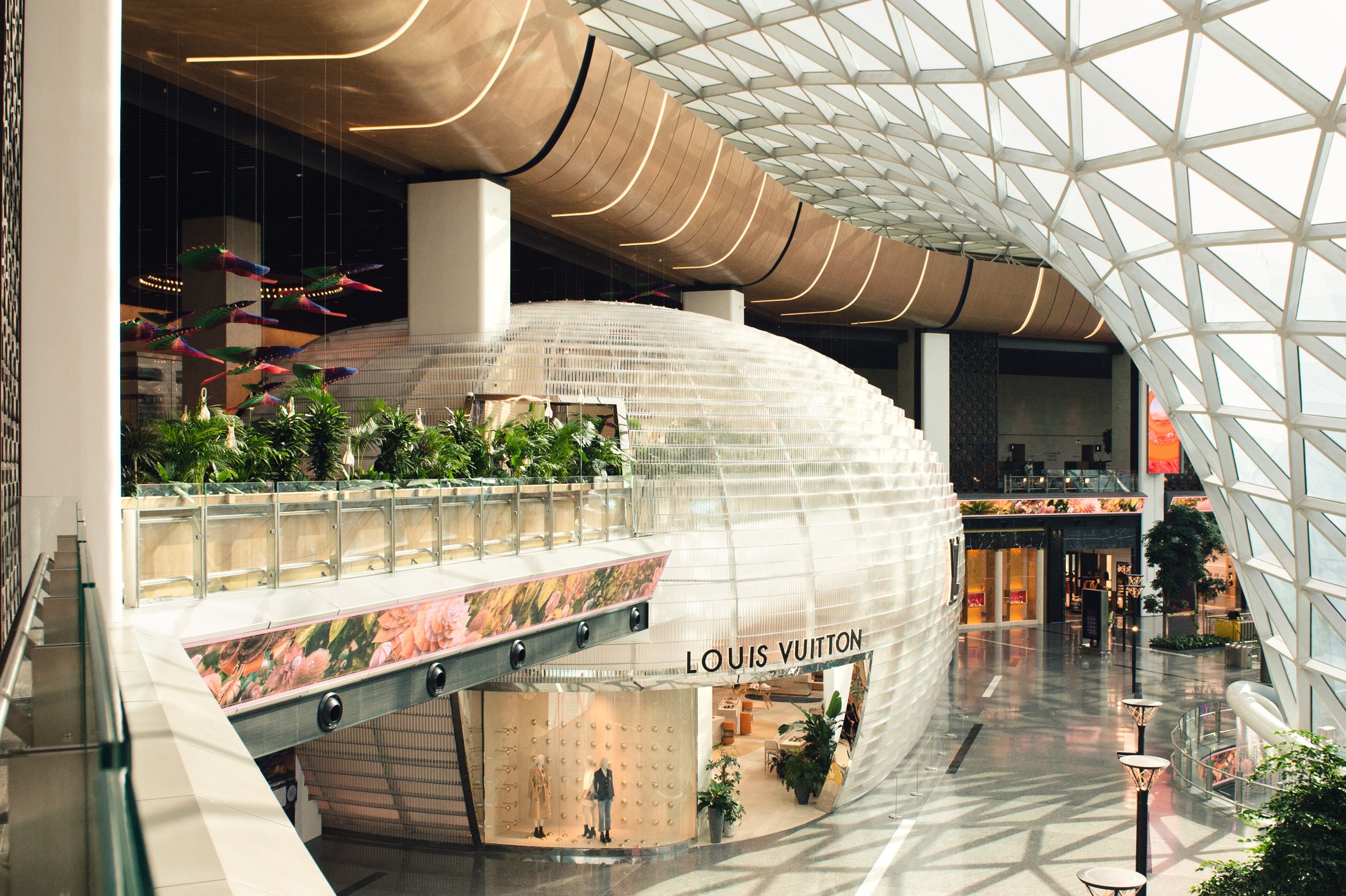 出発前のトラベラーに食事や寛ぎのひとときを提供するこのラウンジ兼レストランは、ルイ・ヴィトンの「旅の真髄(こころ)」を体現すると同時に、メゾンの食の分野における取組みを強化するものでもあります。このラウンジは24時間年中無休で、HIA(ハマド国際空港 / Hamad International Airport)のインドア・ガーデンの緑に包まれたアル・ムルジャン ビジネスラウンジからアクセス可能。柔らかな光で満たされたコンテンポラリーかつトロピカルな空間がお客様をお迎えし、青々とした植物に囲まれてルイ・ヴィトンを象徴するトランクなどのアイテムが展示され、頭上にはアトリエ・オイによるモビール「ケツァール」がカラフルな羽根を広げています。