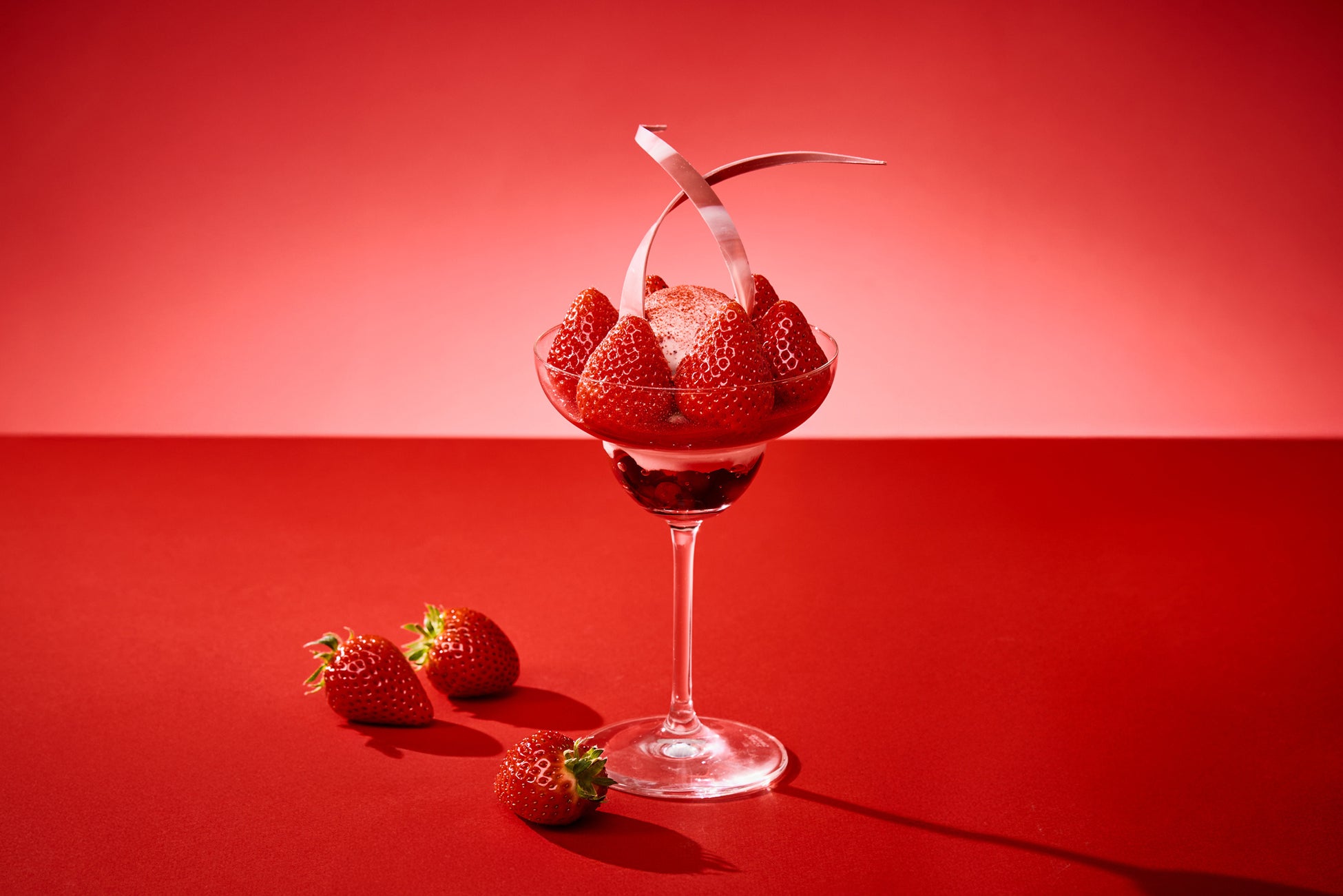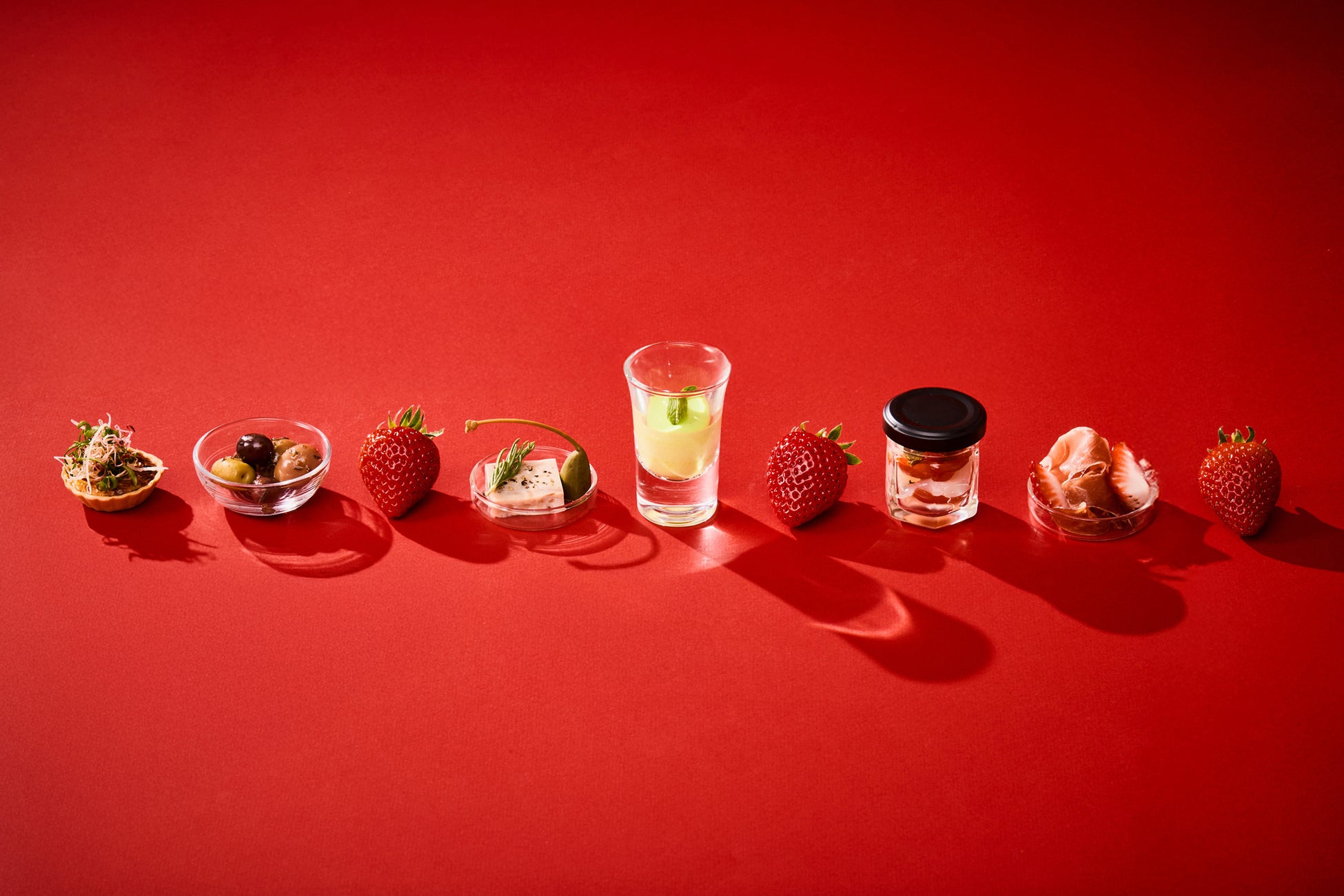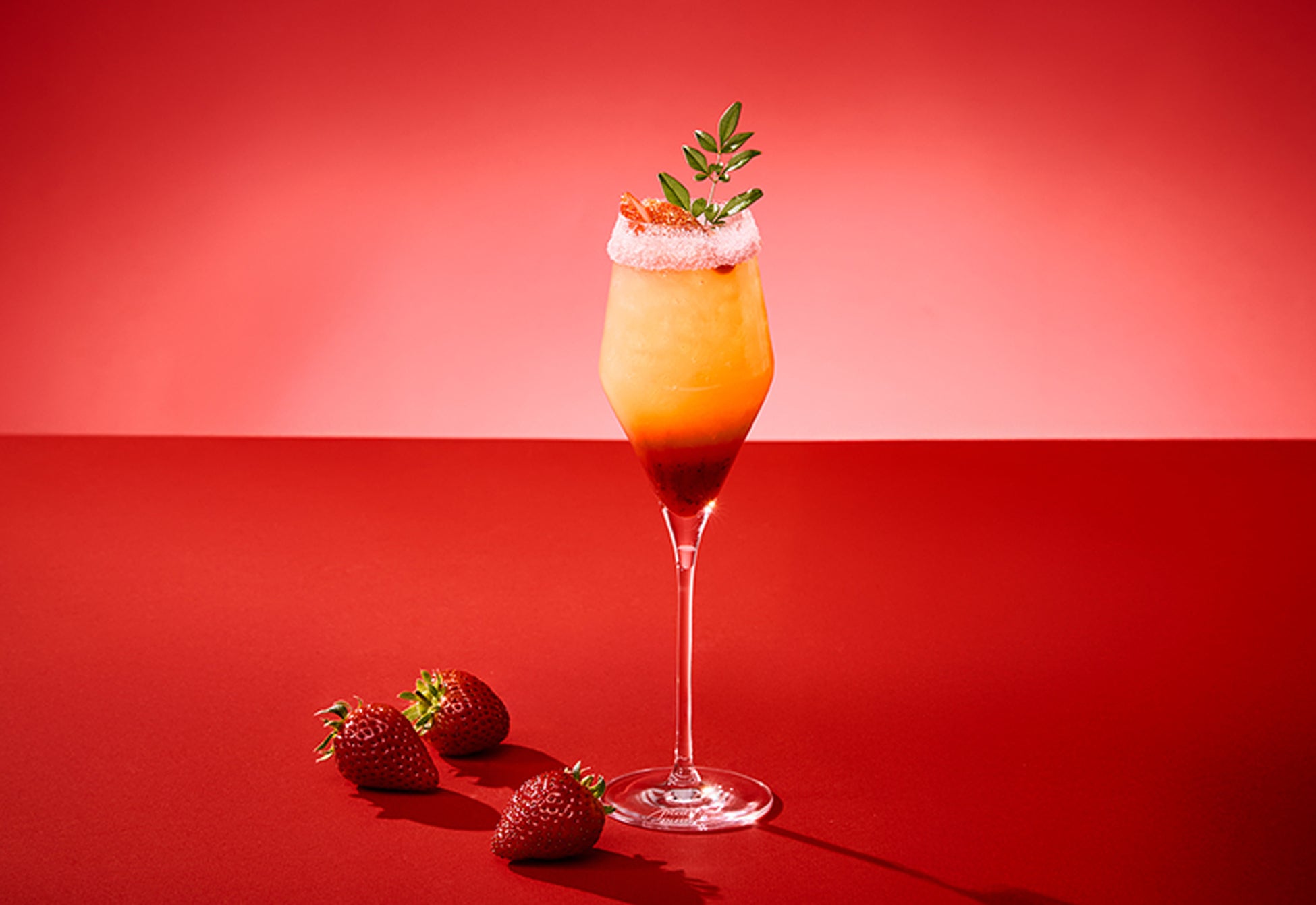 ウェルカムドリンクは伊賀の満天の星空をイメージした「Starlight Express」。パイナップル・オレンジ・レモンのジュースで星空を、その下で育ついちごたちをいちごシロップで表現。トップにはフレッシュいちごをのせて。