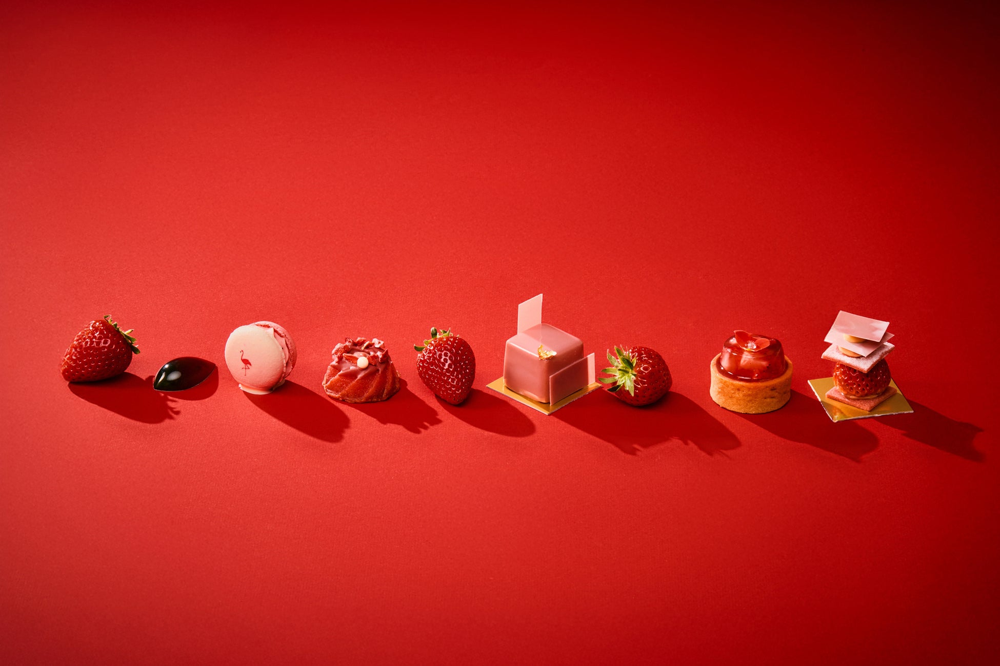くっきりとした甘みと酸味の濃厚さが持ち味の「伊賀満天星いちご®」が様々なスイーツに変身。軽い食感のムースや、プルプルと透き通ったジュレ、いちごにハットをかぶせたようなタルトなど、目移りするようなミニサイズのいちごスイーツたちが、可愛らしくスタンドに整列します。