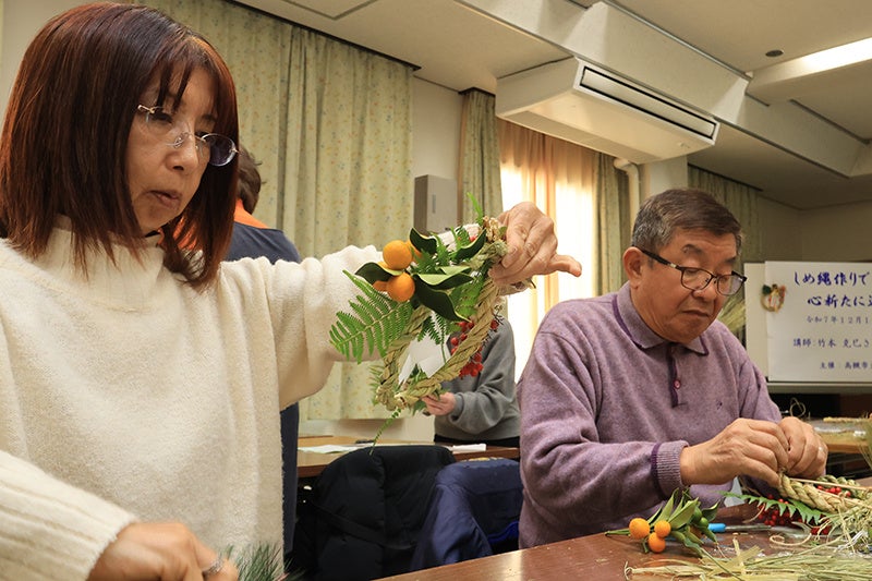 今年は20人が参加し、地元で収穫されたもち米の稲わらを手に取り、しめ縄作りがスタート。参加者は15本から20本ほどを束ね、2人1組になって力を合わせてねじり、講師のアドバイスを受けながら、ねじる強さや向きを確認しながら丁寧に形を整えていきました。十分に締まった縄を円形に整えて結ぶと土台ができあがり、仕上げにナンテン、ウラジロ、水引など縁起物を丁寧に飾り付け、オリジナルのしめ縄が完成。手作りのしめ縄を手にした参加者は、「思ったより力が必要で手が痛くなったけど、貴重な体験ができた」「いい新年が迎えられそう」などと笑顔で話し、わらの香りが広がった会場には、一足早くお正月の雰囲気が漂っていました。