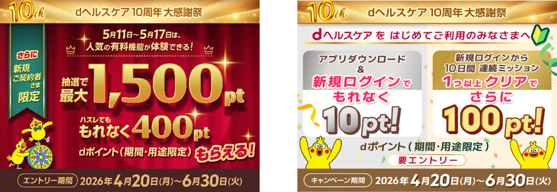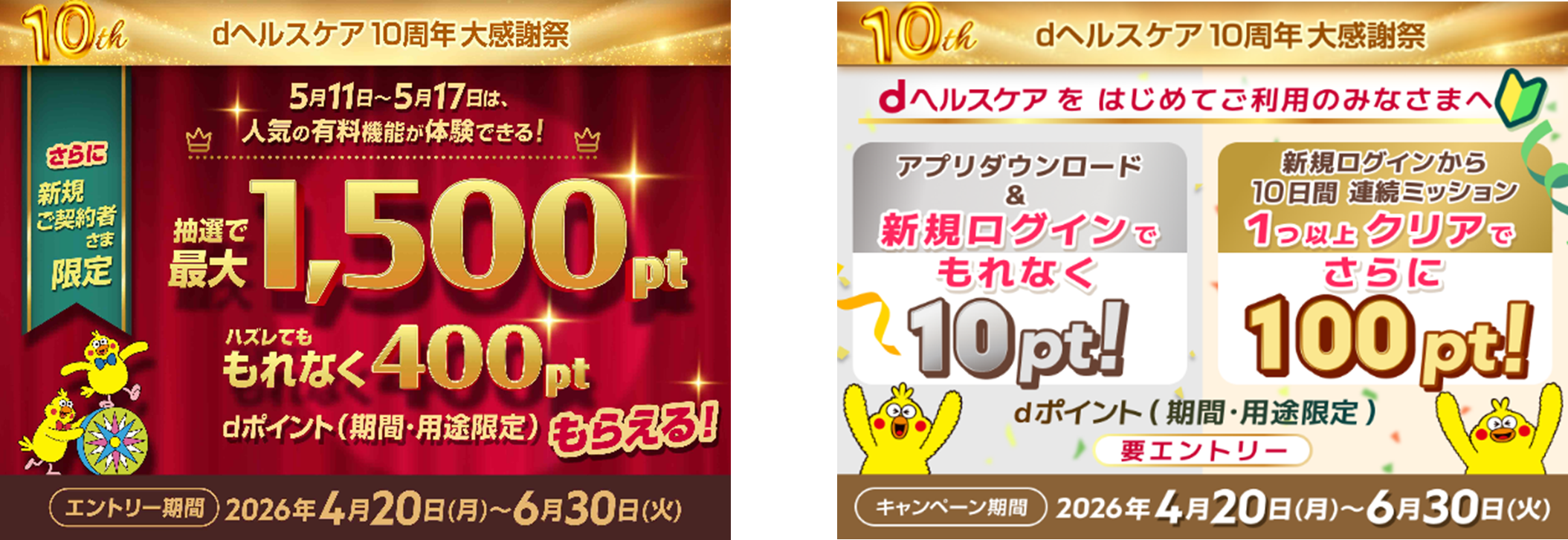 10周年キャンペーンの第一弾として、2026年4月20日(月)から2026年6月30日(火)まで、「【dヘルスケア10周年記念】人気有料機能おためし&最大1,500ポイントもらえるキャンペーン」(以下、おためしキャンペーン)と「【dヘルスケア10周年記念】dヘルスケアをはじめてご利用のみなさまへ ウェルカムキャンペーン」(以下、ウェルカムキャンペーン)を開催(※1)します。