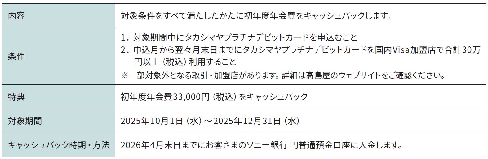 ソニー銀行株式会社(代表取締役社長:南 啓二/本社:東京都千代田区/以下 ソニー銀行)は、株式会社髙島屋(代表取締役社長:村田 善郎/本社:大阪市中央区/以下 髙島屋)と「タカシマヤプラチナデビットカード初年度年会費33,000円キャッシュバックキャンペーン」を2025年10月1日(水)より実施しますのでお知らせします。