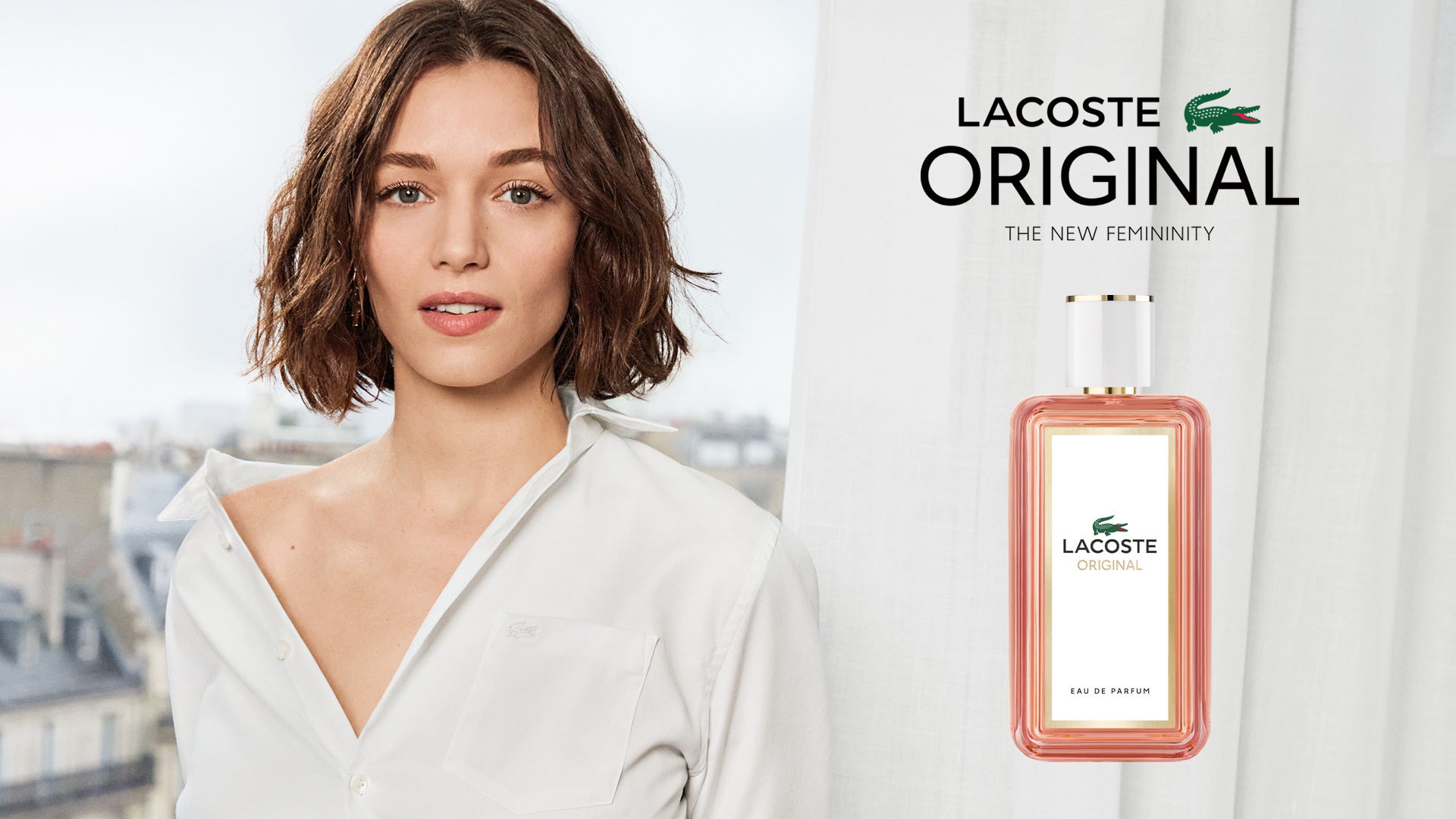 フレンチチャームを体現する彼女は、一目でそれと分かる設定、すなわち、見渡す限りのパリの屋根が広がる窓のあるパリのアパルトマンで撮影されたこの新作フレグランスのキャンペーンに登場しました。髪を下ろし、素顔で、急いで着たかのようなメンズシャツを身につけた彼女は、永遠のフレッシュさと時代を超えたエレガンスを持つラコステの精神を完璧に体現しています。
