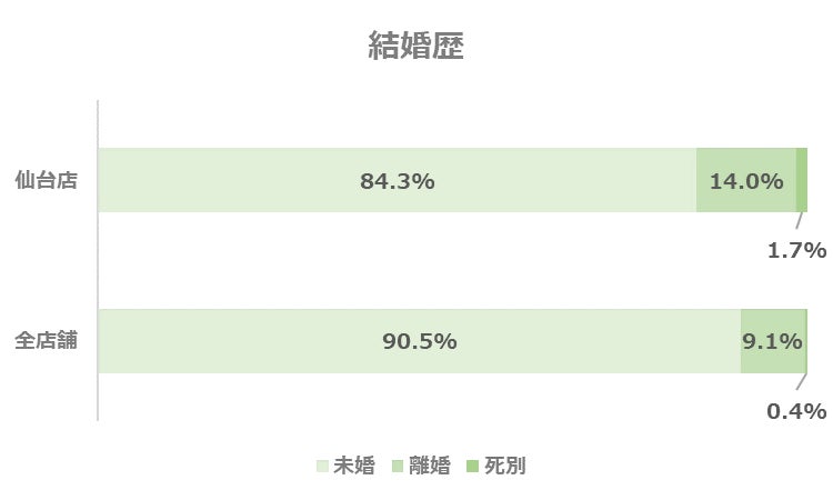 仙台店は全店舗と比較し、婚歴のある方が多い結果となりました。